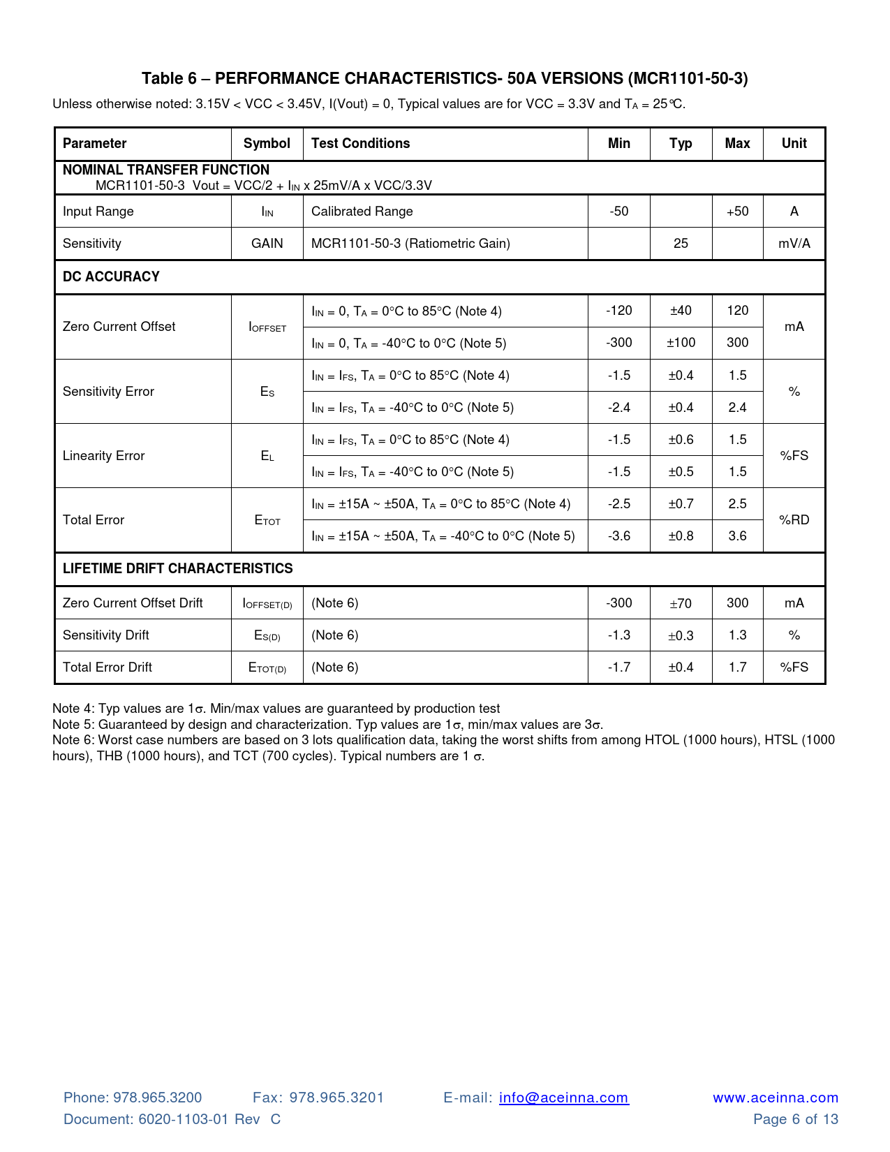 Table 6 – PERFORMANCE CHARACTERISTICS- 50A VERSIONS (MCR1101-50-3) Unless otherwise noted: 3.15V < VCC < 3.45V, I(Vout) = 0, Typical values are for VCC = 3.3V and TA = 25°C. ParameterSymbolTest ConditionsMinTypMaxUnitNOMINAL TRANSFER FUNCTION MCR1101-50-3 Vout = VCC/2 + IIN x 25mV/A x VCC/3.3V Input Range IIN Calibrated Range -50 +50 A Sensitivity GAIN MCR1101-50-3 (Ratiometric Gain) 25 mV/A DC ACCURACY IIN = 0, TA = 0C to 85C (Note 4) -120 ±40 120 Zero Current Offset IOFFSET mA IIN = 0, TA = -40C to 0C (Note 5) -300 ±100 300 IIN = IFS, TA = 0C to 85C (Note 4) -1.5 ±0.4 1.5 Sensitivity Error ES % IIN = IFS, TA = -40C to 0C (Note 5) -2.4 ±0.4 2.4 IIN = IFS, TA = 0C to 85C (Note 4) -1.5 ±0.6 1.5 Linearity Error EL %FS IIN = IFS, TA = -40C to 0C (Note 5) -1.5 ±0.5 1.5 IIN = ±15A ~ ±50A, TA = 0C to 85C (Note 4) -2.5 ±0.7 2.5 Total Error ETOT %RD IIN = ±15A ~ ±50A, TA = -40C to 0C (Note 5) -3.6 ±0.8 3.6 LIFETIME DRIFT CHARACTERISTICS Zero Current Offset Drift IOFFSET(D) (Note 6) -300 70 300 mA Sensitivity Drift ES(D) (Note 6) -1.3 0.3 1.3 % Total Error Drift ETOT(D) (Note 6) -1.7 ±0.4 1.7 %FS Note 4: Typ values are 1. Min/max values are guaranteed by production test Note 5: Guaranteed by design and characterization. Typ values are 1, min/max values are 3. Note 6: Worst case numbers are based on 3 lots qualification data, taking the worst shifts from among HTOL (1000 hours), HTSL (1000 hours), THB (1000 hours), and TCT (700 cycles). Typical numbers are 1 . Phone: 978.965.3200 Fax: 978.965.3201 E-mail: info@aceinna.com www.aceinna.com Document: 6020-1103-01 Rev C Page 6 of 13