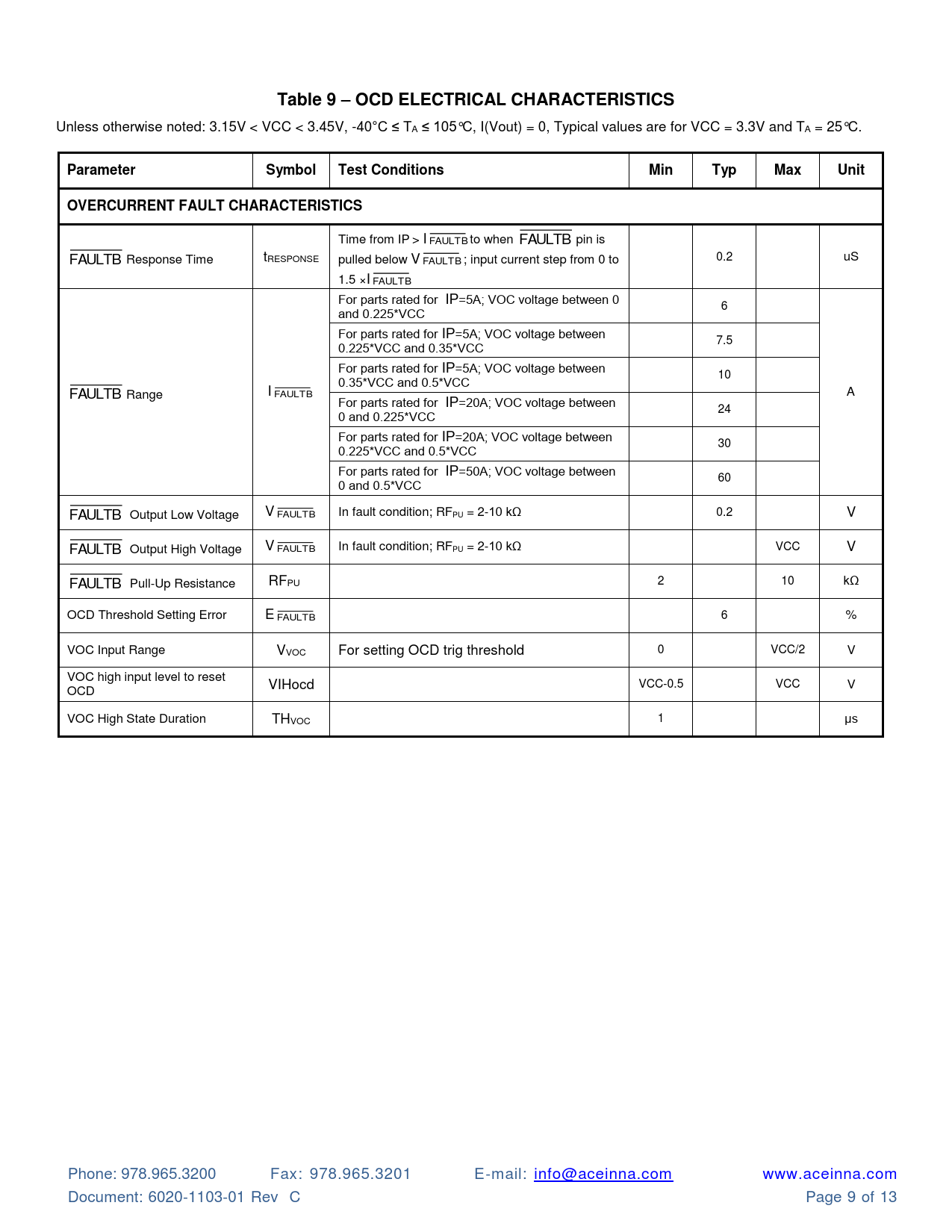 Time from IP > I FAULTB to when FAULTB pin is FAULTB Response Time tRESPONSE pulled below V FAULTB ; input current step from 0 to 0.2 uS 1.5 ×I FAULTB For parts rated for IP=5A; VOC voltage between 0 6 and 0.225*VCC For parts rated for IP=5A; VOC voltage between 7.5 0.225*VCC and 0.35*VCC For parts rated for IP=5A; VOC voltage between 0.35*VCC and 0.5*VCC 10 FAULTB Range I FAULTB A For parts rated for IP=20A; VOC voltage between 24 0 and 0.225*VCC For parts rated for IP=20A; VOC voltage between 30 0.225*VCC and 0.5*VCC For parts rated for IP=50A; VOC voltage between 60 0 and 0.5*VCC FAULTB Output Low Voltage V FAULTB In fault condition; RFPU = 2-10 kΩ 0.2 V FAULTB Output High Voltage V FAULTB In fault condition; RFPU = 2-10 kΩ VCC V FAULTB Pull-Up Resistance RFPU 2 10 kΩ OCD Threshold Setting Error E FAULTB 6 % VOC Input Range VVOC For setting OCD trig threshold 0 VCC/2 V VOC high input level to reset VIHocd VCC-0.5 VCC V OCD VOC High State Duration THVOC 1 μs Phone: 978.965.3200 Fax: 978.965.3201 E-mail: info@aceinna.com www.aceinna.com Document: 6020-1103-01 Rev C Page 9 of 13