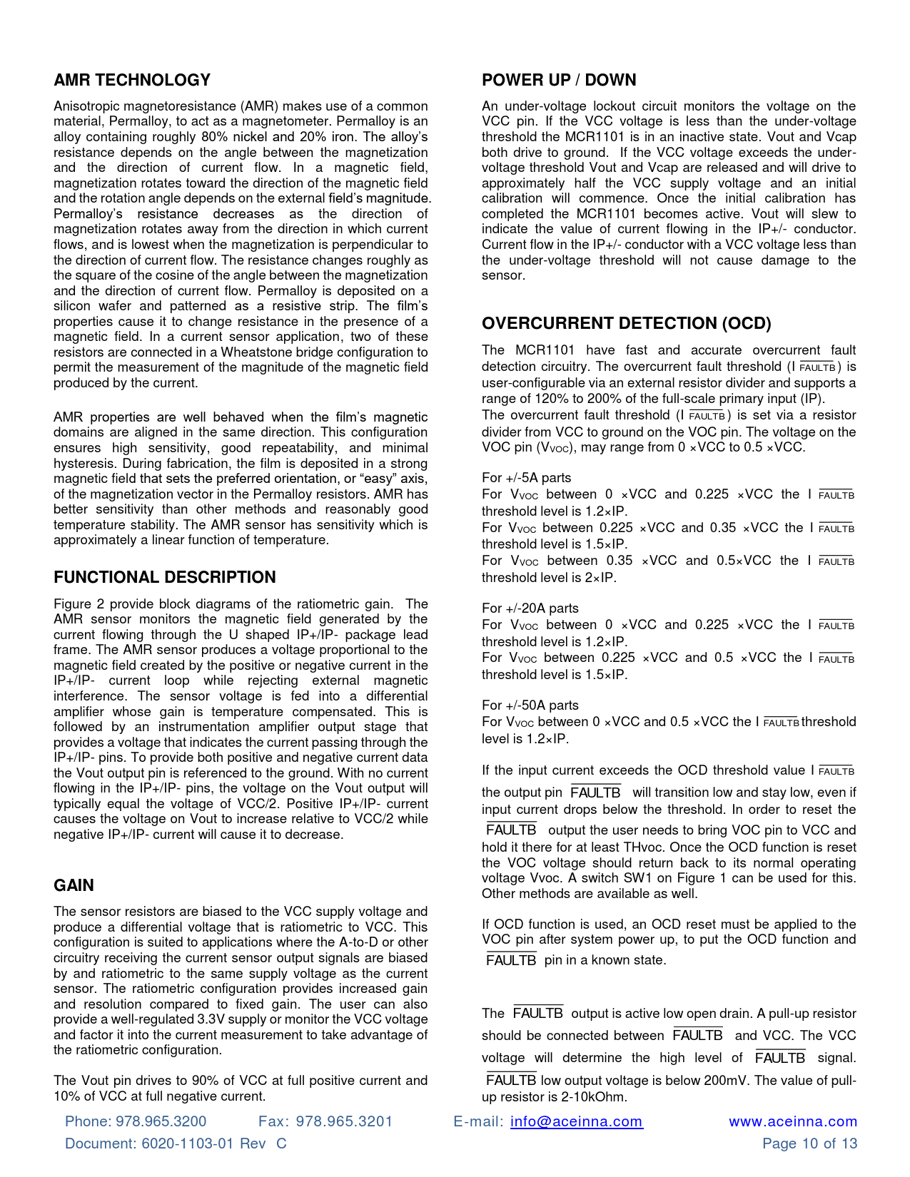 threshold level is 2×IP. Figure 2 provide block diagrams of the ratiometric gain. The For +/-20A parts AMR sensor monitors the magnetic field generated by the For VVOC between 0 ×VCC and 0.225 ×VCC the I FAULTB current flowing through the U shaped IP+/IP- package lead threshold level is 1.2×IP. frame. The AMR sensor produces a voltage proportional to the For V FAULTB magnetic field created by the positive or negative current in the VOC between 0.225 ×VCC and 0.5 ×VCC the I IP+/IP- current loop while rejecting external magnetic threshold level is 1.5×IP. interference. The sensor voltage is fed into a differential amplifier whose gain is temperature compensated. This is For +/-50A parts followed by an instrumentation amplifier output stage that For VVOC between 0 ×VCC and 0.5 ×VCC the I FAULTB threshold provides a voltage that indicates the current passing through the level is 1.2×IP. IP+/IP- pins. To provide both positive and negative current data the Vout output pin is referenced to the ground. With no current If the input current exceeds the OCD threshold value I FAULTB flowing in the IP+/IP- pins, the voltage on the Vout output will the output pin FAULTB will transition low and stay low, even if typically equal the voltage of VCC/2. Positive IP+/IP- current input current drops below the threshold. In order to reset the causes the voltage on Vout to increase relative to VCC/2 while negative IP+/IP- current will cause it to decrease. FAULTB output the user needs to bring VOC pin to VCC and hold it there for at least THvoc. Once the OCD function is reset the VOC voltage should return back to its normal operating voltage Vvoc. A switch SW1 on Figure 1 can be used for this.