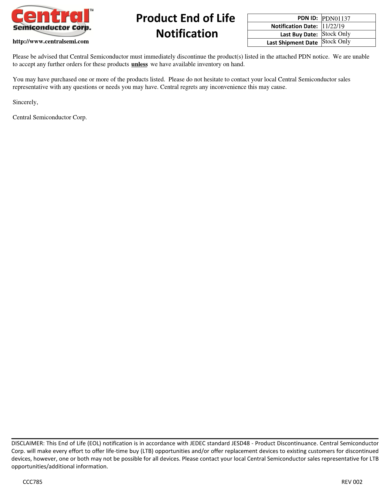 Stock Only Please be advised that Central Semiconductor must immediately discontinue the product(s) listed in the attached PDN notice. We are unable to accept any further orders for these products