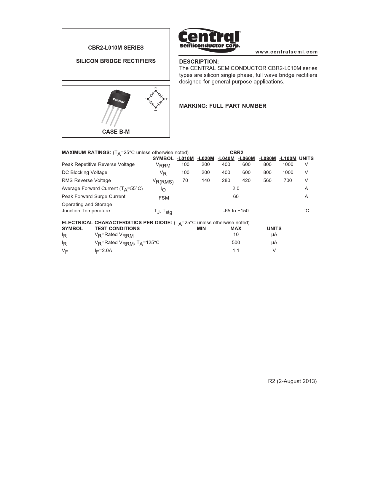 CBR2-L010M SERIES. w w w. c e n t r a l s e m i . c o m. SILICON BRIDGE RECTIFIERS. DESCRIPTION:. MARKING: FULL PART NUMBER
