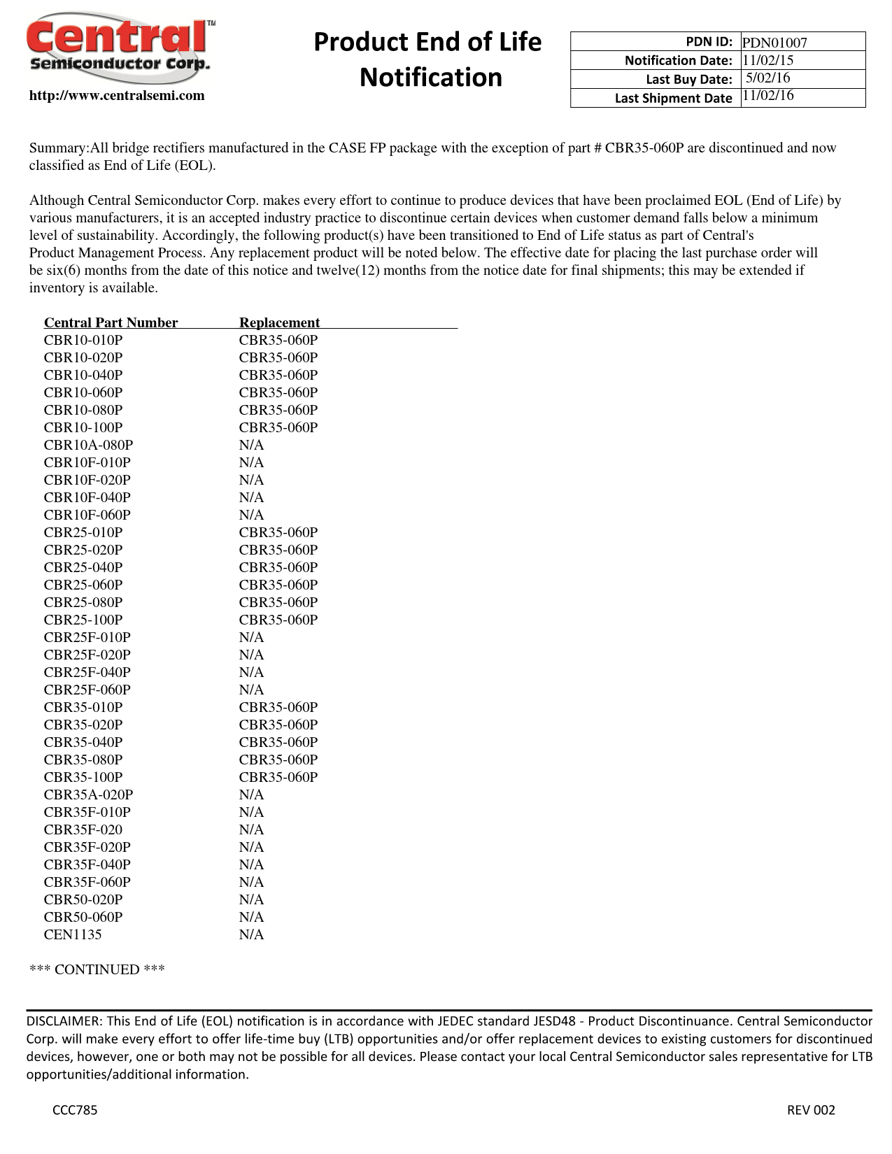 11/02/16 Summary:All bridge rectifiers manufactured in the CASE FP package with the exception of part # CBR35-060P are discontinued and now classified as End of Life (EOL). Although Central Semiconductor Corp. makes every effort to continue to produce devices that have been proclaimed EOL (End of Life) by various manufacturers, it is an accepted industry practice to discontinue certain devices when customer demand falls below a minimum level of sustainability. Accordingly, the following product(s) have been transitioned to End of Life status as part of Central's Product Management Process. Any replacement product will be noted below. The effective date for placing the last purchase order will be six(6) months from the date of this notice and twelve(12) months from the notice date for final shipments; this may be extended if inventory is available.