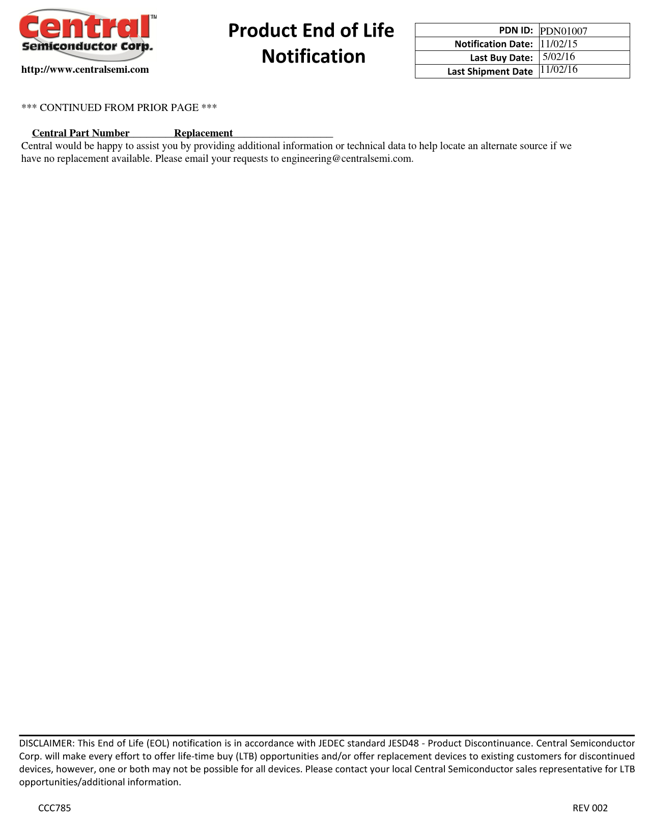 _________________________ Central would be happy to assist you by providing additional information or technical data to help locate an alternate source if we have no replacement available. Please email your requests to engineering@centralsemi.com.