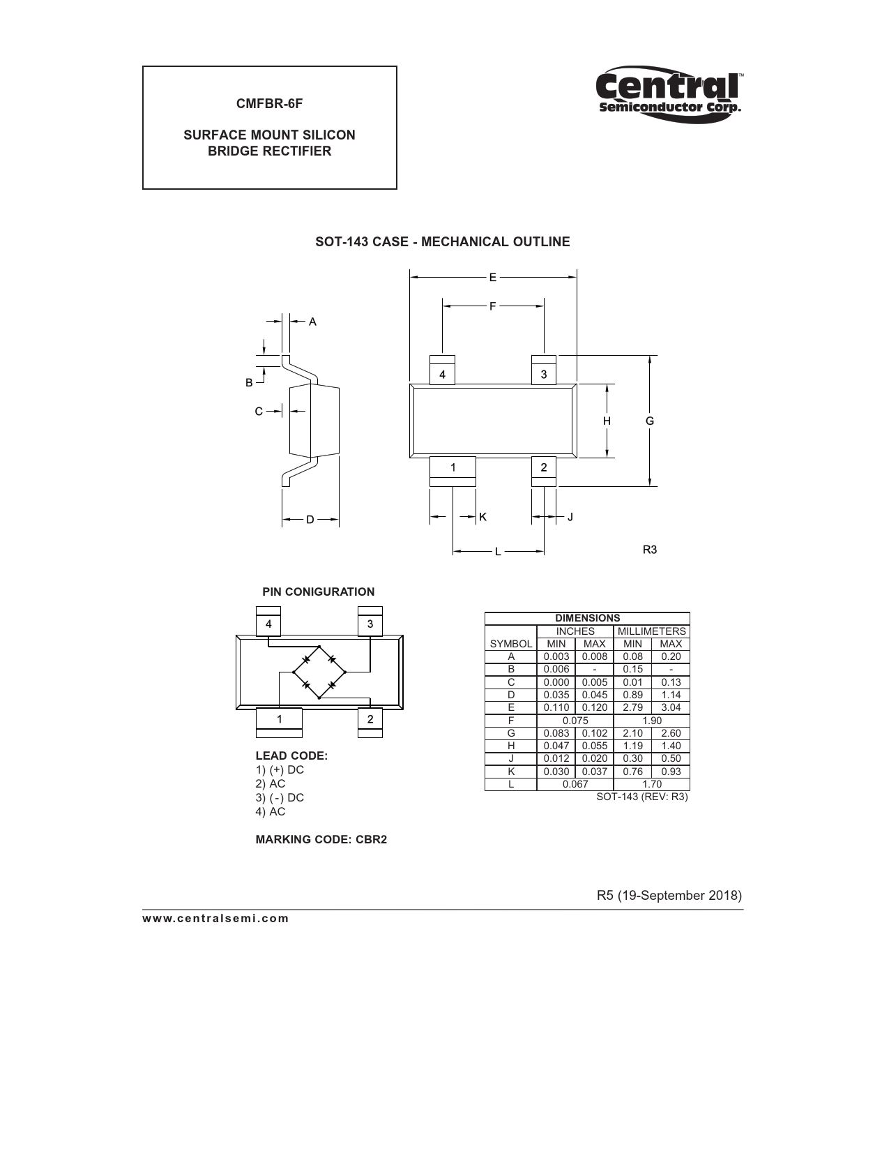 CMFBR-6F. SURFACE MOUNT SILICON. BRIDGE RECTIFIER. SOT-143 CASE - MECHANICAL OUTLINE. PIN CONIGURATION. DIMENSIONS. LEAD CODE: