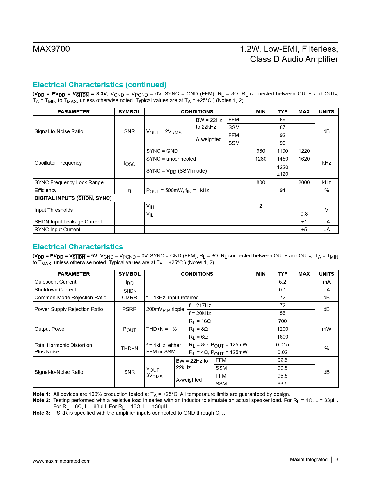 Quiescent Current IDD 5.2 mA Shutdown Current ISHDN 0.1 µA Common-Mode Rejection Ratio CMRR f = 1kHz, input referred 72 dB f = 217Hz 72 Power-Supply Rejection Ratio PSRR 200mVP-P ripple dB f = 20kHz 55 RL = 16Ω 700 Output Power POUT THD+N = 1% RL = 8Ω 1200 mW RL = 6Ω 1600 Total Harmonic Distortion RL = 8Ω, POUT = 125mW 0.015 Plus Noise THD+N f = 1kHz, either FFM or SSM % RL = 4Ω, POUT = 125mW 0.02 BW = 22Hz to FFM 92.5 22kHz SSM 90.5 Signal-to-Noise Ratio SNR VOUT = 3V dB RMS FFM 95.5 A-weighted SSM 93.5