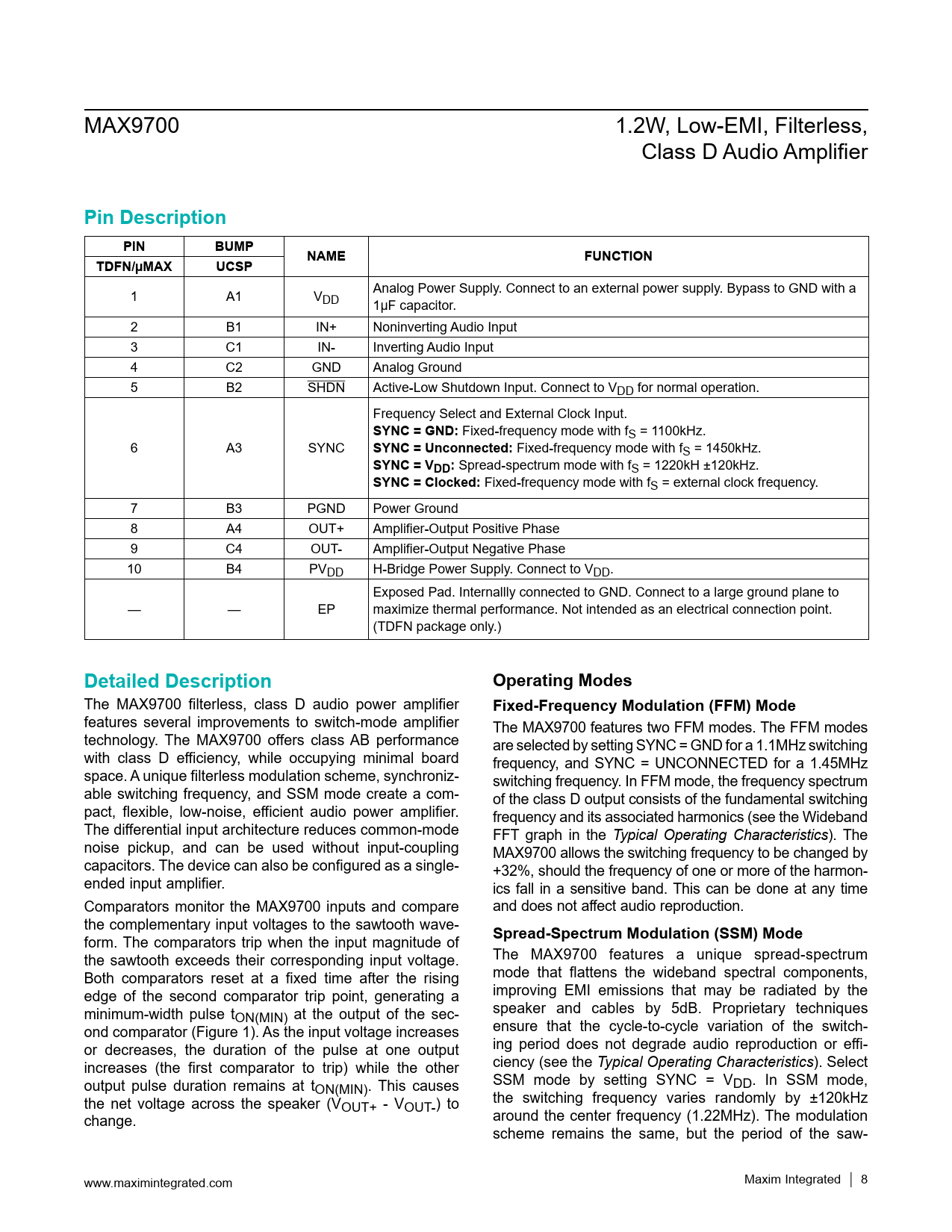 MAX9700 1.2W, Low-EMI, Filterless, Class D Audio Amplifier Pin DescriptionPINBUMPNAMEFUNCTIONTDFN/µMAXUCSP 1 A1 V Analog Power Supply. Connect to an external power supply. Bypass to GND with a DD 1µF capacitor. 2 B1 IN+ Noninverting Audio Input 3 C1 IN- Inverting Audio Input 4 C2 GND Analog Ground 5 B2 SHDN Active-Low Shutdown Input. Connect to VDD for normal operation. Frequency Select and External Clock Input. SYNC = GND: Fixed-frequency mode with fS = 1100kHz. 6 A3 SYNC SYNC = Unconnected: Fixed-frequency mode with fS = 1450kHz. SYNC = VDD: Spread-spectrum mode with fS = 1220kH ±120kHz. SYNC = Clocked: Fixed-frequency mode with fS = external clock frequency. 7 B3 PGND Power Ground 8 A4 OUT+ Amplifier-Output Positive Phase 9 C4 OUT- Amplifier-Output Negative Phase 10 B4 PVDD H-Bridge Power Supply. Connect to VDD. Exposed Pad. Internallly connected to GND. Connect to a large ground plane to — — EP maximize thermal performance. Not intended as an electrical connection point. (TDFN package only.) Detailed DescriptionOperating Modes The MAX9700 filterless, class D audio power amplifier Fixed-Frequency Modulation (FFM) Mode features several improvements to switch-mode amplifier The MAX9700 features two FFM modes. The FFM modes technology. The MAX9700 offers class AB performance are selected by setting SYNC = GND for a 1.1MHz switching with class D efficiency, while occupying minimal board frequency, and SYNC = UNCONNECTED for a 1.45MHz space. A unique filterless modulation scheme, synchroniz- switching frequency. In FFM mode, the frequency spectrum able switching frequency, and SSM mode create a com- of the class D output consists of the fundamental switching pact, flexible, low-noise, efficient audio power amplifier. frequency and its associated harmonics (see the Wideband The differential input architecture reduces common-mode FFT graph in the Typical Operating Characteristics). The noise pickup, and can be used without input-coupling MAX9700 allows the switching frequency to be changed by capacitors. The device can also be configured as a single- +32%, should the frequency of one or more of the harmon- ended input amplifier. ics fall in a sensitive band. This can be done at any time Comparators monitor the MAX9700 inputs and compare and does not affect audio reproduction. the complementary input voltages to the sawtooth wave- form. The comparators trip when the input magnitude of Spread-Spectrum Modulation (SSM) Mode the sawtooth exceeds their corresponding input voltage. The MAX9700 features a unique spread-spectrum Both comparators reset at a fixed time after the rising mode that flattens the wideband spectral components, edge of the second comparator trip point, generating a improving EMI emissions that may be radiated by the minimum-width pulse t speaker and cables by 5dB. Proprietary techniques ON(MIN) at the output of the sec- ond comparator (Figure 1). As the input voltage increases ensure that the cycle-to-cycle variation of the switch- or decreases, the duration of the pulse at one output ing period does not degrade audio reproduction or effi- increases (the first comparator to trip) while the other ciency (see the Typical Operating Characteristics). Select output pulse duration remains at t SSM mode by setting SYNC = V ON(MIN). This causes DD. In SSM mode, the net voltage across the speaker (V the switching frequency varies randomly by ±120kHz OUT+ - VOUT-) to change. around the center frequency (1.22MHz). The modulation scheme remains the same, but the period of the saw- www.maximintegrated.com Maxim Integrated │ 8