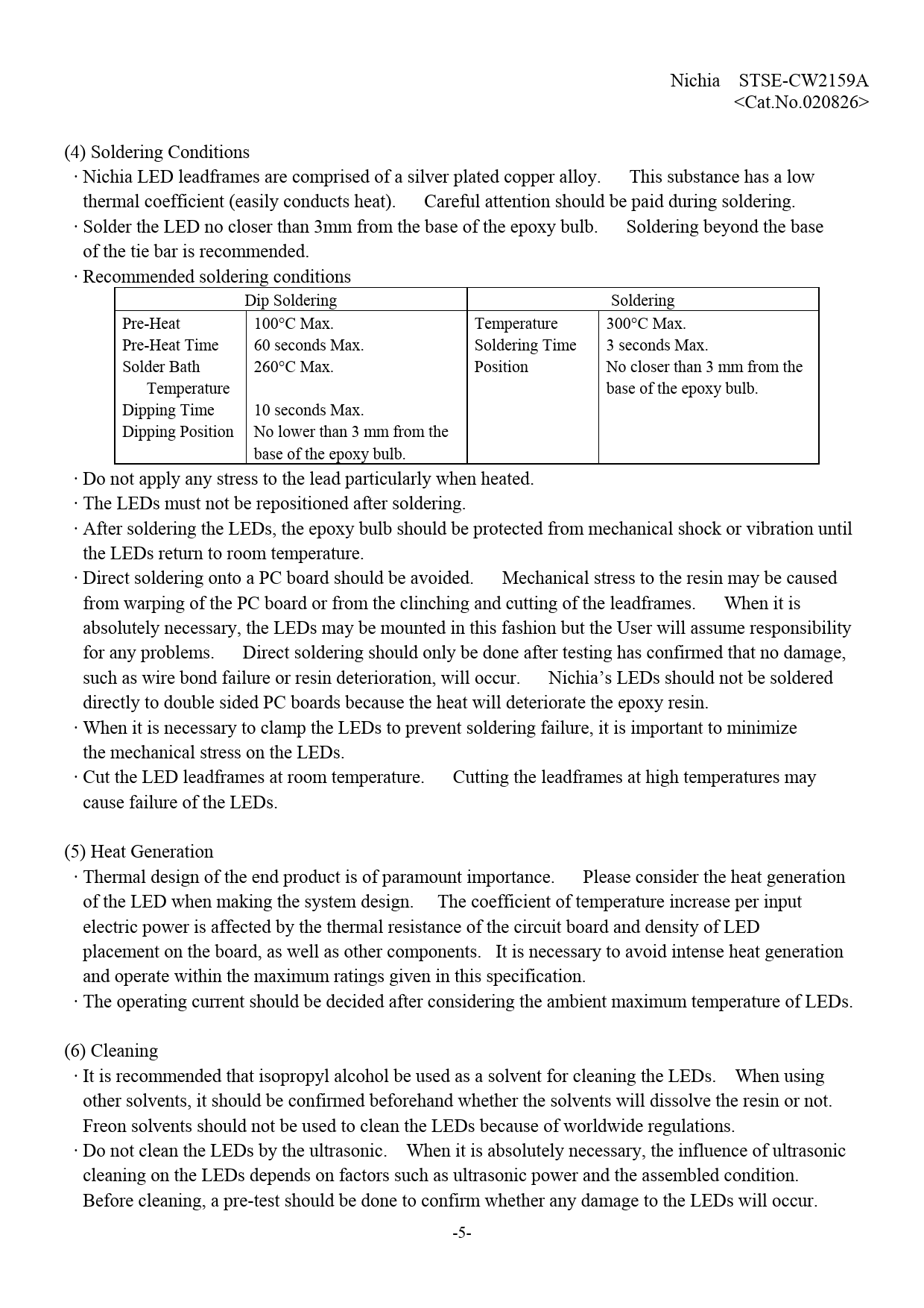 Nichia STSE-CW2159A (4) Soldering Conditions Nichia LED leadframes are comprised of a silver plated copper alloy.