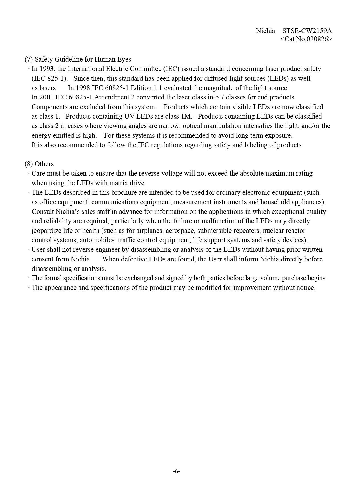 Nichia STSE-CW2159A (7) Safety Guideline for Human Eyes In 1993, the International Electric Committee (IEC) issued a standard concerning laser product safety