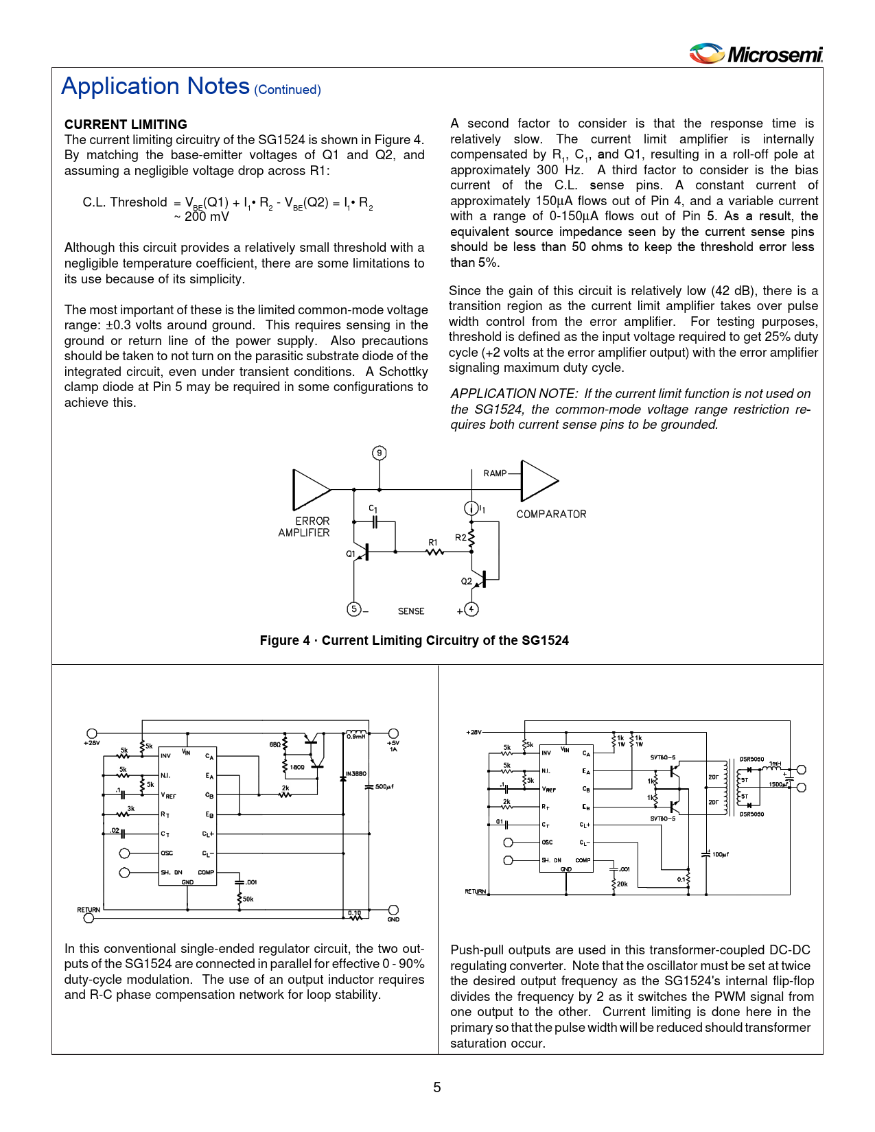A second factor to consider is that the response time is The current limiting circuitry of the SG1524 is shown in Figure 4. relatively slow. The current limit amplifier is internally By matching the base-emitter voltages of Q1 and Q2, and compensated by R , C , and Q1, resulting in a roll-off pole at 1 1 assuming a negligible voltage drop across R1: approximately 300 Hz. A third factor to consider is the bias current of the C.L. sense pins. A constant current of C.L. Threshold = V (Q1) + I • R - V (Q2) = I • R approximately 150µA flows out of Pin 4, and a variable current BE 1 2 BE 1 2 ~ 200 mV with a range of 0-150µA flows out of Pin 5. As a result, the equivalent source impedance seen by the current sense pins Although this circuit provides a relatively small threshold with a should be less than 50 ohms to keep the threshold error less negligible temperature coefficient, there are some limitations to than 5%. its use because of its simplicity. Since the gain of this circuit is relatively low (42 dB), there is a The most important of these is the limited common-mode voltage transition region as the current limit amplifier takes over pulse range: ±0.3 volts around ground. This requires sensing in the width control from the error amplifier. For testing purposes, ground or return line of the power supply. Also precautions threshold is defined as the input voltage required to get 25% duty should be taken to not turn on the parasitic substrate diode of the cycle (+2 volts at the error amplifier output) with the error amplifier integrated circuit, even under transient conditions. A Schottky signaling maximum duty cycle. clamp diode at Pin 5 may be required in some configurations to APPLICATION NOTE: If the current limit function is not used on achieve this. the SG1524, the common-mode voltage range restriction re- quires both current sense pins to be grounded.