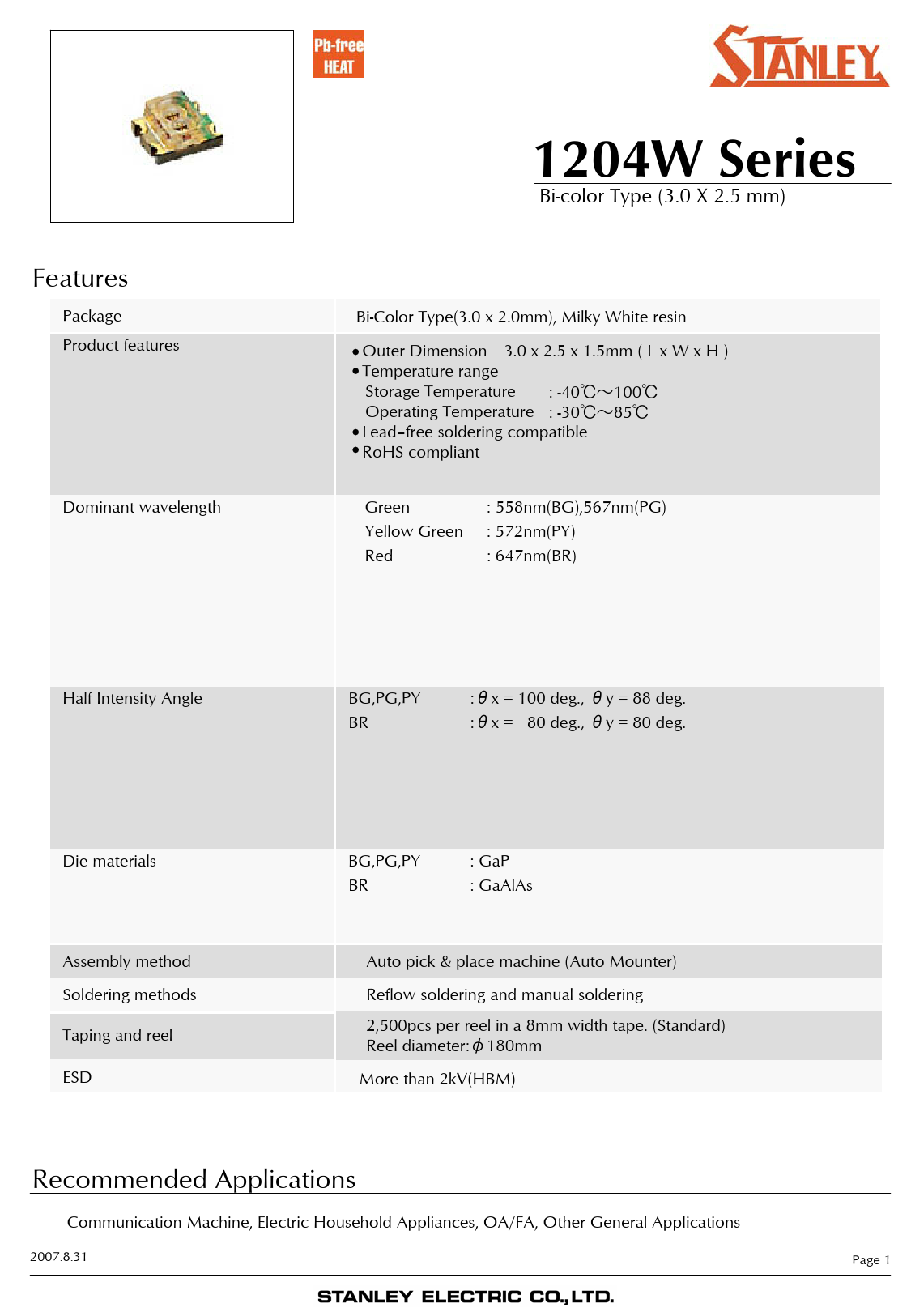 1204W Series Bi-color Type (3.0 X 2.5 mm) Features Package Bi-Color Type(3.0 x 2.0mm), Milky White resin Product features Outer Dimension 3.0 x 2.5 x 1.5mm ( L x W x H ) Temperature range Storage Temperature : -40℃~100℃ Operating Temperature : -30℃~85℃ Lead–free soldering compatible RoHS compliant Dominant wavelength Green : 558nm(BG),567nm(PG) Yellow Green : 572nm(PY) Red : 647nm(BR) Half Intensity Angle BG,PG,PY :θx = 100 deg., θy = 88 deg. BR :θx = 80 deg., θy = 80 deg. Die materials BG,PG,PY : GaP BR : GaAlAs Assembly method Auto pick & place machine (Auto Mounter) Soldering methods Reflow soldering and manual soldering 2,500pcs per reel in a 8mm width tape. (Standard) Taping and reel Reel diameter:φ180mm ESD More than 2kV(HBM) Recommended Applications Communication Machine, Electric Household Appliances, OA/FA, Other General Applications 2007.8.31 Page 1 Document Outline スライド番号 1 スライド番号 2 スライド番号 3 スライド番号 4 スライド番号 5 スライド番号 6 スライド番号 7 スライド番号 8 スライド番号 9 スライド番号 10 スライド番号 11 スライド番号 12 スライド番号 13 スライド番号 14