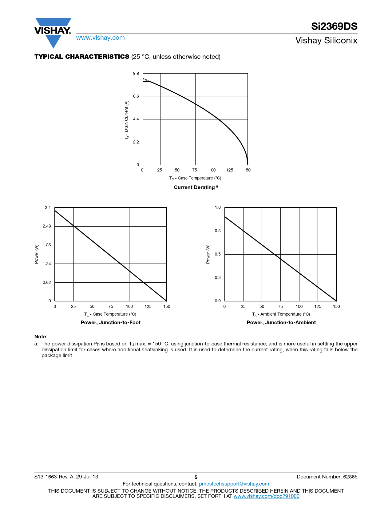 Si2369DS www.vishay.com Vishay Siliconix TYPICAL CHARACTERISTICS (25 °C, unless otherwise noted) 8.8 6.6 ) (A Current 4.4 Drain - I D 2.2 0 0 25 50 75 100 125 150 T - Case Temperature (°C) C Current Derating a 3.1 1.0 2.48 0.8 ) 1.86 ) W W r ( r ( e e 0.5 w w Po 1.24 Po 0.3 0.62 0 0.0 0 25 50 75 100 125 150 0 25 50 75 100 125 150 T - Case Temperature (°C) T - Ambient Temperature (°C) C A Power, Junction-to-FootPower, Junction-to-AmbientNote a. The power dissipation PD is based on TJ max. = 150 °C, using junction-to-case thermal resistance, and is more useful in settling the upper dissipation limit for cases where additional heatsinking is used. It is used to determine the current rating, when this rating falls below the package limit S13-1663-Rev. A, 29-Jul-13 5 Document Number: 62865 For technical questions, contact: pmostechsupport@vishay.com THIS DOCUMENT IS SUBJECT TO CHANGE WITHOUT NOTICE. THE PRODUCTS DESCRIBED HEREIN AND THIS DOCUMENT ARE SUBJECT TO SPECIFIC DISCLAIMERS, SET FORTH AT www.vishay.com/doc?91000