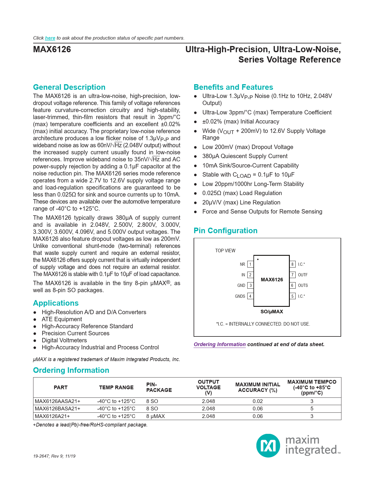 here. MAX6126. Ultra-High-Precision, Ultra-Low-Noise,. Series Voltage Reference. General Description. Benefits and Features