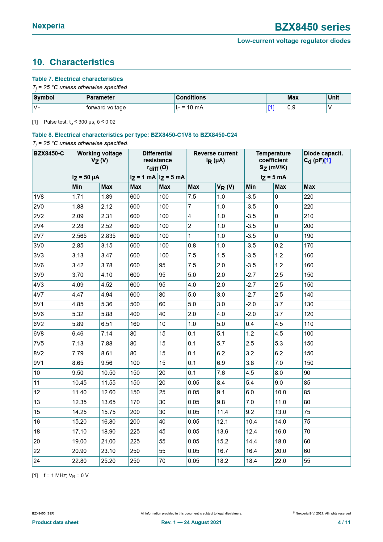 1V8 1.71 1.89 600 100 7.5 1.0 -3.5 0 220 2V0 1.88 2.12 600 100 7 1.0 -3.5 0 220 2V2 2.09 2.31 600 100 4 1.0 -3.5 0 210 2V4 2.28 2.52 600 100 2 1.0 -3.5 0 200 2V7 2.565 2.835 600 100 1 1.0 -3.5 0 190 3V0 2.85 3.15 600 100 0.8 1.0 -3.5 0.2 170 3V3 3.13 3.47 600 100 7.5 1.5 -3.5 1.2 160 3V6 3.42 3.78 600 95 7.5 2.0 -3.5 1.2 160 3V9 3.70 4.10 600 95 5.0 2.0 -2.7 2.5 150 4V3 4.09 4.52 600 95 4.0 2.0 -2.7 2.5 150 4V7 4.47 4.94 600 80 5.0 3.0 -2.7 2.5 140 5V1 4.85 5.36 500 60 5.0 3.0 -2.0 3.7 130 5V6 5.32 5.88 400 40 2.0 4.0 -2.0 3.7 120 6V2 5.89 6.51 160 10 1.0 5.0 0.4 4.5 110 6V8 6.46 7.14 80 15 0.1 5.1 1.2 4.5 100 7V5 7.13 7.88 80 15 0.1 5.7 2.5 5.3 150 8V2 7.79 8.61 80 15 0.1 6.2 3.2 6.2 150 9V1 8.65 9.56 100 15 0.1 6.9 3.8 7.0 150 10 9.50 10.50 150 20 0.1 7.6 4.5 8.0 90 11 10.45 11.55 150 20 0.05 8.4 5.4 9.0 85 12 11.40 12.60 150 25 0.05 9.1 6.0 10.0 85 13 12.35 13.65 170 30 0.05 9.8 7.0 11.0 80 15 14.25 15.75 200 30 0.05 11.4 9.2 13.0 75 16 15.20 16.80 200 40 0.05 12.1 10.4 14.0 75 18 17.10 18.90 225 45 0.05 13.6 12.4 16.0 70 20 19.00 21.00 225 55 0.05 15.2 14.4 18.0 60 22 20.90 23.10 250 55 0.05 16.7 16.4 20.0 60 24 22.80 25.20 250 70 0.05 18.2 18.4 22.0 55 [1] f = 1 MHz; VR = 0 V BZX8450_SER All information provided in this document is subject to legal disclaimers. © Nexperia B.V. 2021. Al rights reserved