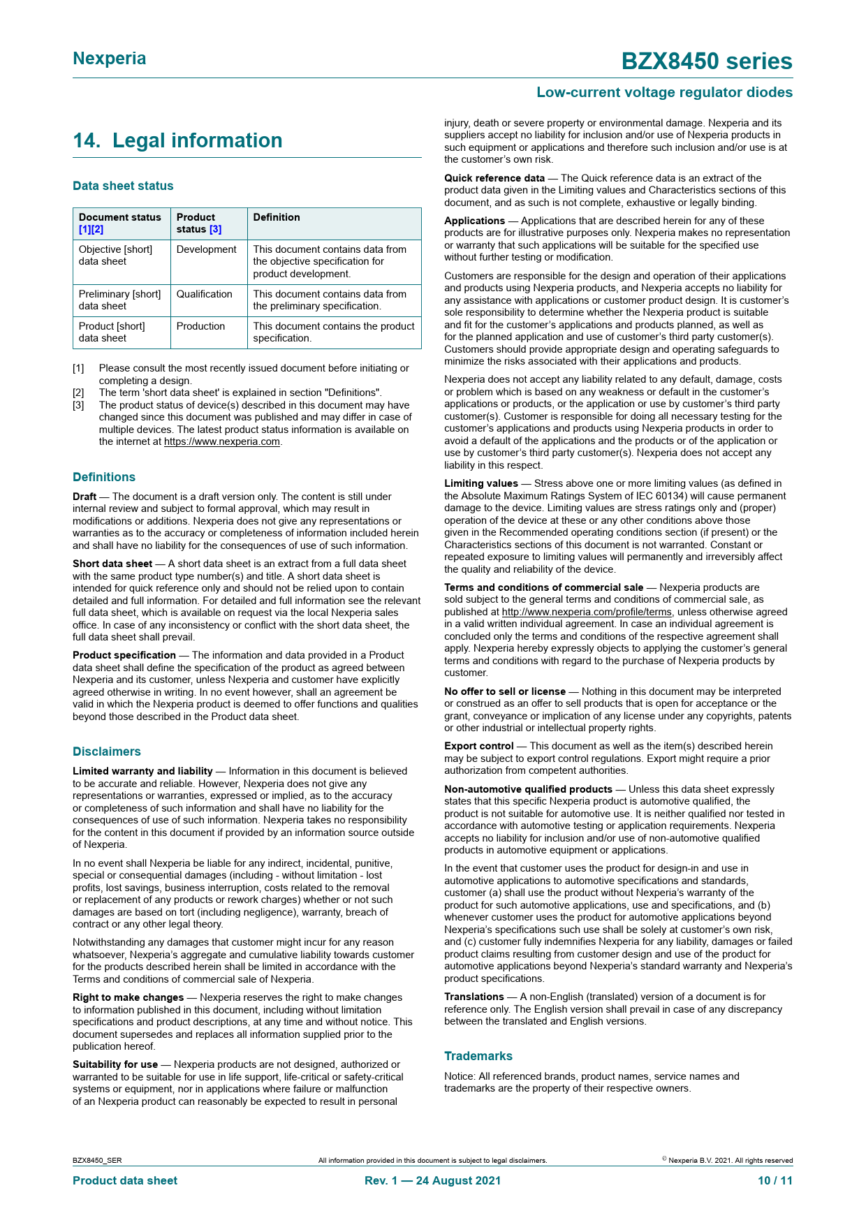 | 页数 / 页 | 11 / 10 — Nexperia. BZX8450 series. Low-current voltage regulator diodes. 14. Legal … |