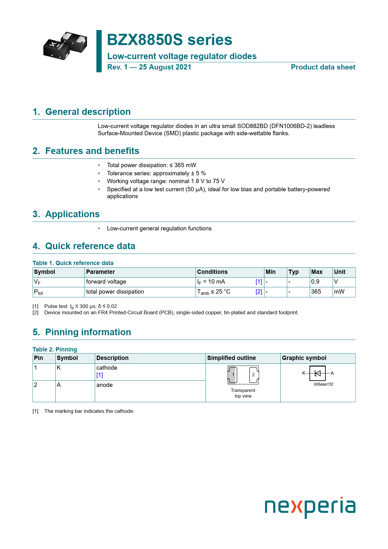 link to page 1 link to page 1 link to page 1 BZX8850S seriesLow-current voltage regulator diodesRev. 1 — 25 August 2021Product data sheet1. General description Low-current voltage regulator diodes in an ultra small SOD882BD (DFN1006BD-2) leadless Surface-Mounted Device (SMD) plastic package with side-wettable flanks. 2. Features and benefits • Total power dissipation: ≤ 365 mW • Tolerance series: approximately ± 5 % • Working voltage range: nominal 1.8 V to 75 V • Specified at a low test current (50 μA), ideal for low bias and portable battery-powered applications 3. Applications • Low-current general regulation functions 4. Quick reference data Table 1. Quick reference dataSymbolParameterConditionsMinTypMaxUnit VF forward voltage IF = 10 mA [1] - - 0.9 V Ptot total power dissipation Tamb ≤ 25 °C [2] - - 365 mW [1] Pulse test: tp ≤ 300 μs; δ ≤ 0.02 [2] Device mounted on an FR4 Printed-Circuit Board (PCB), single-sided copper, tin-plated and standard footprint. 5. Pinning information Table 2. PinningPinSymbolDescriptionSimplified outlineGraphic symbol 1 K cathode [1] 1 2 K A 2 A anode 006aaa152 Transparent top view [1] The marking bar indicates the cathode. Document Outline 1. General description 2. Features and benefits 3. Applications 4. Quick reference data 5. Pinning information 6. Ordering information 7. Marking 8. Limiting values 9. Thermal characteristics 10. Characteristics 11. Package outline 12. Soldering 13. Revision history 14. Legal information Contents
