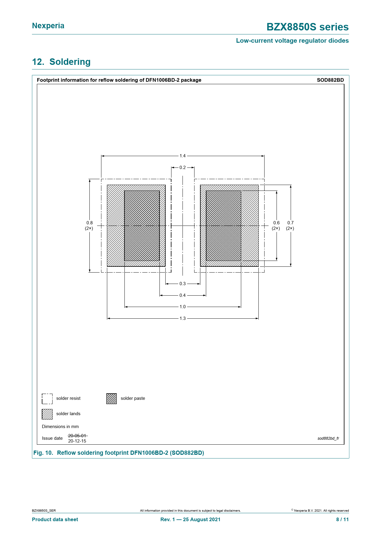 1.4 0.2 0.8 0.6 0.7 (2×) (2×) (2×) 0.3 0.4 1.0 1.3 solder resist solder paste solder lands Dimensions in mm Issue date 20-05-01 sod882bd_fr 20-12-15