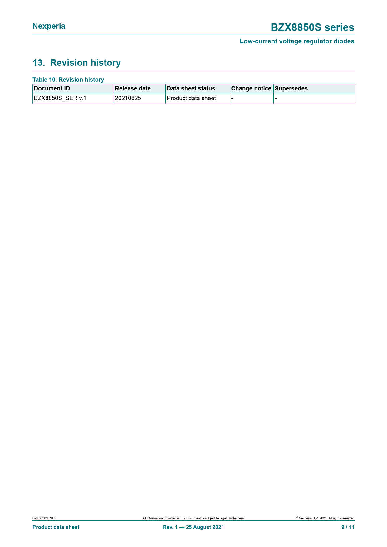 Nexperia. BZX8850S series. Low-current voltage regulator diodes. 13. Revision history Table 10. Revision history. Document ID