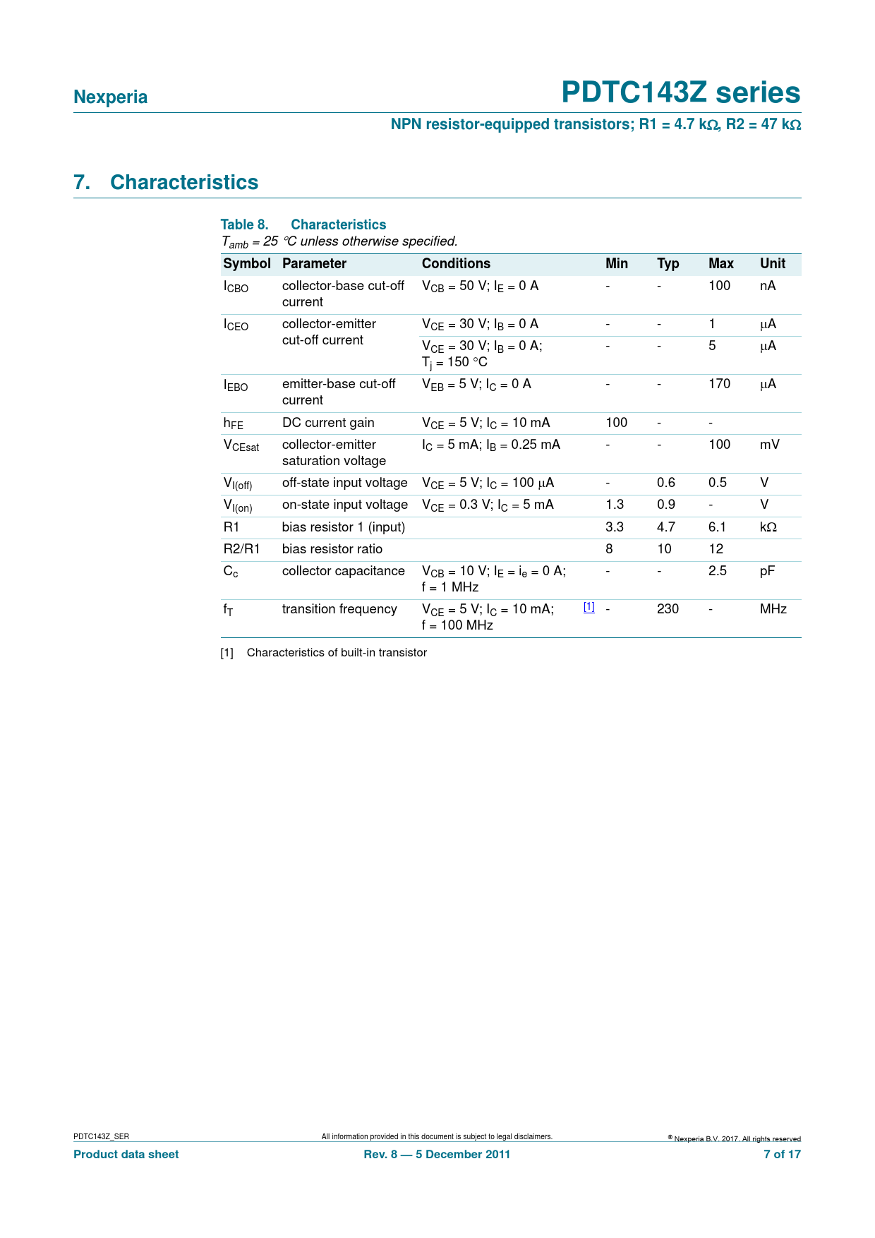 Nexperia. PDTC143Z series. NPN resistor-equipped transistors; R1 = 4.7 k. , R2 = 47 k. 7. Characteristics. Table 8. Characteristics