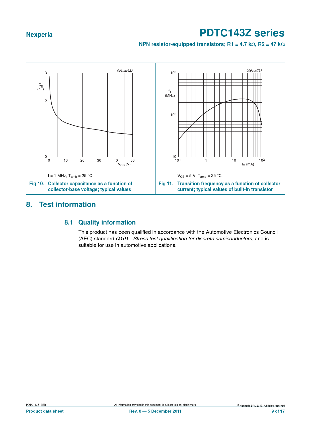 Fig 10. Collector capacitance as a function of Fig 11. Transition frequency as a function of collector collector-base voltage; typical values current; typical values of built-in transistor 8. Test information 8.1 Quality information