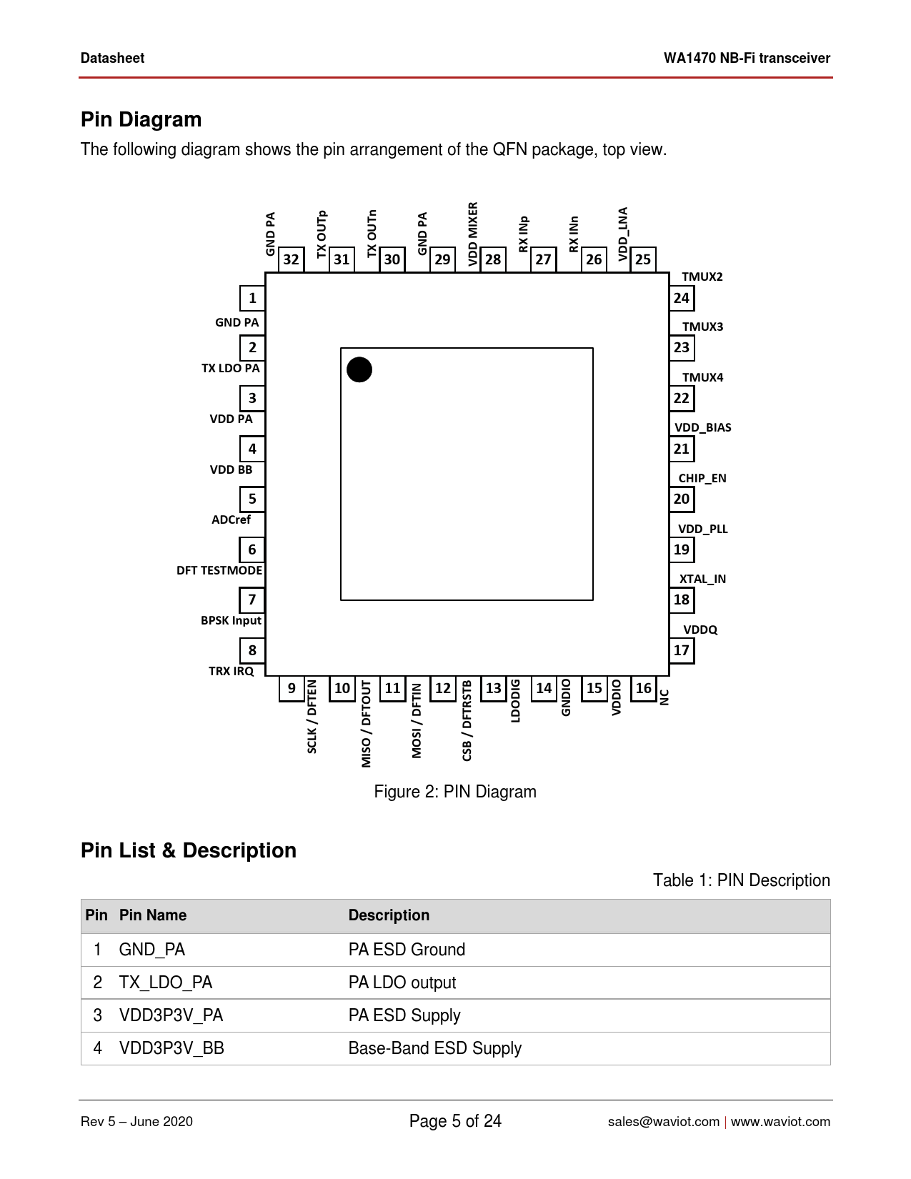 Datasheet WA1470 NB-Fi transceiver Pin Diagram