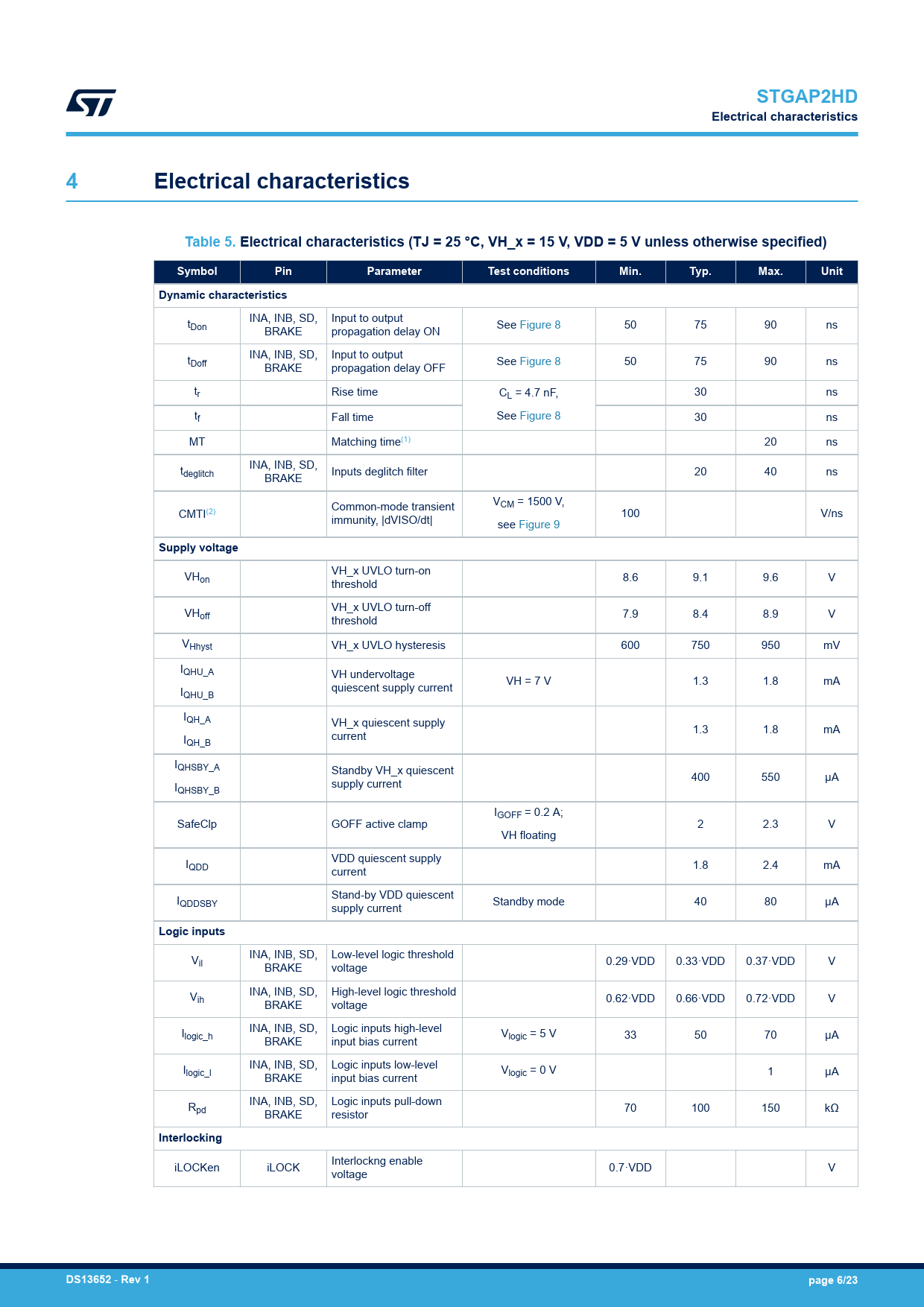 link to page 14 link to page 14 link to page 14 link to page 7 link to page 7 link to page 14 STGAP2HDElectrical characteristics4Electrical characteristicsTable 5. Electrical characteristics (TJ = 25 °C, VH_x = 15 V, VDD = 5 V unless otherwise specified)SymbolPinParameterTest conditionsMin.Typ.Max.UnitDynamic characteristics t INA, INB, SD, Input to output Don See Figure 8 50 75 90 ns BRAKE propagation delay ON t INA, INB, SD, Input to output Doff See Figure 8 50 75 90 ns BRAKE propagation delay OFF tr Rise time CL = 4.7 nF, 30 ns tf Fall time See Figure 8 30 ns MT Matching time(1) 20 ns t INA, INB, SD, deglitch Inputs deglitch filter 20 40 ns BRAKE Common-mode transient VCM = 1500 V, CMTI(2) 100 V/ns immunity, |dVISO/dt| see Figure 9 Supply voltage VH VH_x UVLO turn-on on 8.6 9.1 9.6 V threshold VH VH_x UVLO turn-off off 7.9 8.4 8.9 V threshold VHhyst VH_x UVLO hysteresis 600 750 950 mV IQHU_A VH undervoltage VH = 7 V 1.3 1.8 mA I quiescent supply current QHU_B IQH_A VH_x quiescent supply 1.3 1.8 mA I current QH_B IQHSBY_A Standby VH_x quiescent 400 550 µA I supply current QHSBY_B IGOFF = 0.2 A; SafeClp GOFF active clamp 2 2.3 V VH floating I VDD quiescent supply QDD 1.8 2.4 mA current I Stand-by VDD quiescent QDDSBY Standby mode 40 80 µA supply current Logic inputs V INA, INB, SD, Low-level logic threshold il 0.29·VDD 0.33·VDD 0.37·VDD V BRAKE voltage V INA, INB, SD, High-level logic threshold ih 0.62·VDD 0.66·VDD 0.72·VDD V BRAKE voltage I INA, INB, SD, Logic inputs high-level logic_h V BRAKE input bias current logic = 5 V 33 50 70 µA I INA, INB, SD, Logic inputs low-level logic_l V BRAKE input bias current logic = 0 V 1 µA R INA, INB, SD, Logic inputs pull-down pd 70 100 150 kΩ BRAKE resistor Interlocking Interlockng enable iLOCKen iLOCK 0.7·VDD V voltage DS13652 - Rev 1page 6/23 Document Outline Cover image Product status link / summary Features Application Description 1 Block diagram 2 Pin description and connection diagram 3 Electrical data 3.1 Absolute maximum ratings 3.2 Thermal data 3.3 Recommended operating conditions 4 Electrical characteristics 5 Isolation 6 Functional description 6.1 Gate driving power supply and UVLO 6.2 Power-up, power-down and ‘safe state’ 6.3 Control Inputs 6.4 Watchdog 6.5 Thermal shutdown protection 6.6 Standby function 6.7 Interlocking function 7 Typical application diagram 8 Layout 8.1 Layout guidelines and considerations 8.2 Layout example 9 Testing and characterization information 10 Package information 10.1 SO-36W package information 11 Suggested land pattern 12 Ordering information Revision history Contents List of tables List of figures