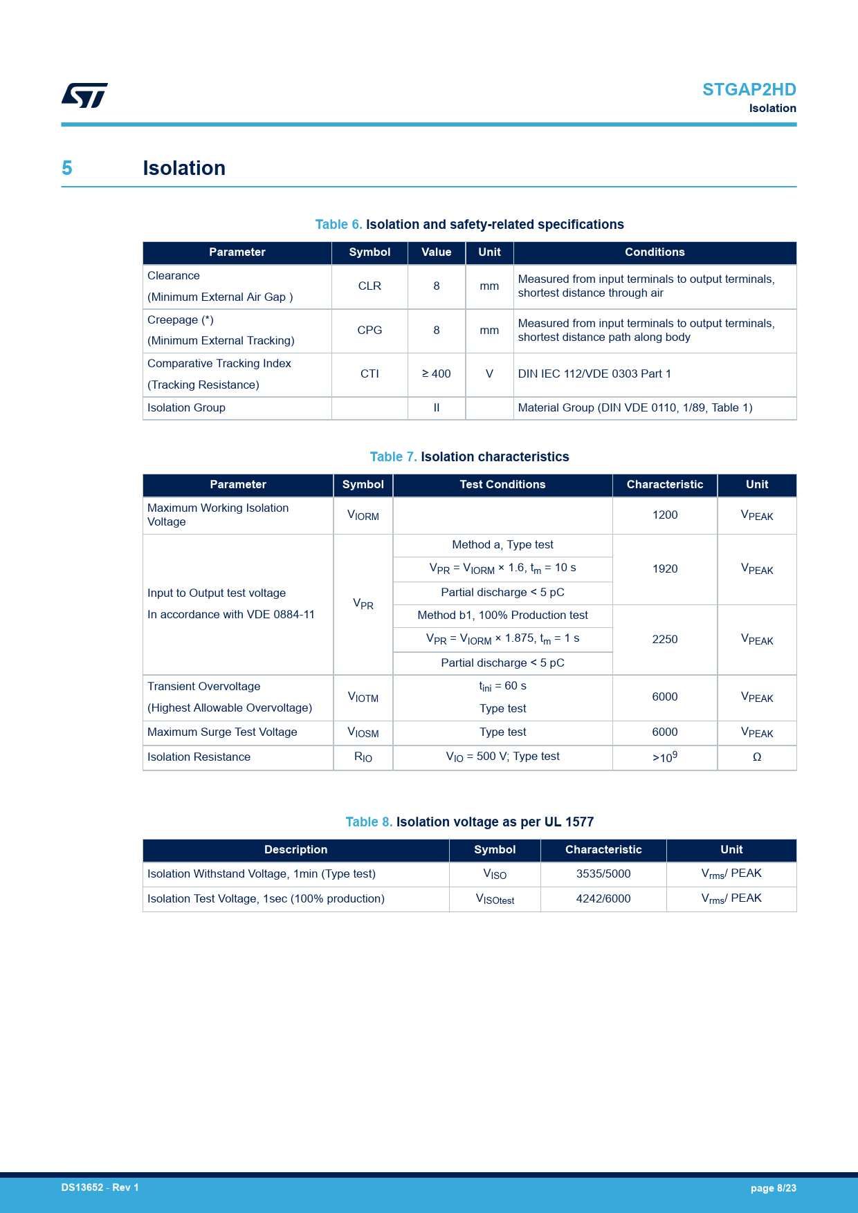 STGAP2HD Isolation Table 6 Isolation and safety-related specifications Parameter Symbol Value Unit Conditions