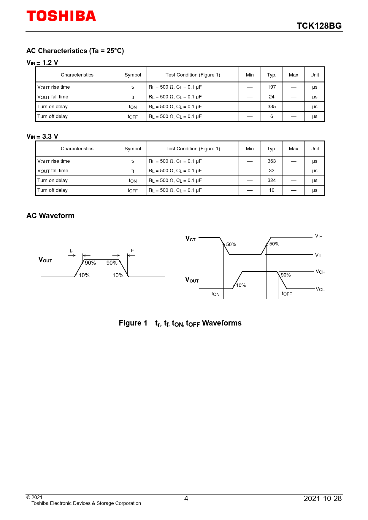 TCK128BG. AC Characteristics (Ta = 25°C). VIN = 1.2 V. VIN = 3.3 V. AC Waveform. VCT. OUT. Figure 1 tr, tf, tON, tOFF Waveforms