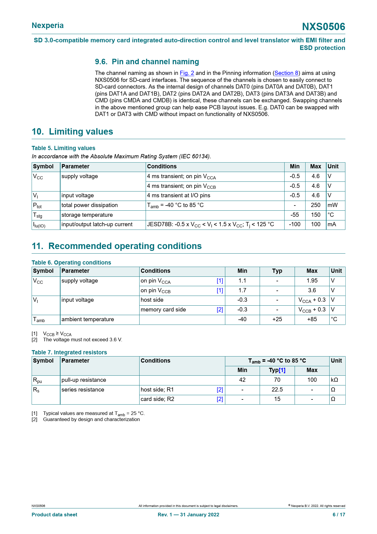 Rpu pull-up resistance 42 70 100 kΩ Rs series resistance host side; R1 [2] - 22.5 - Ω card side; R2 [2] - 15 - Ω [1] Typical values are measured at Tamb = 25 °C. [2] Guaranteed by design and characterization NXS0506 All information provided in this document is subject to legal disclaimers. © Nexperia B.V. 2022. Al rights reserved