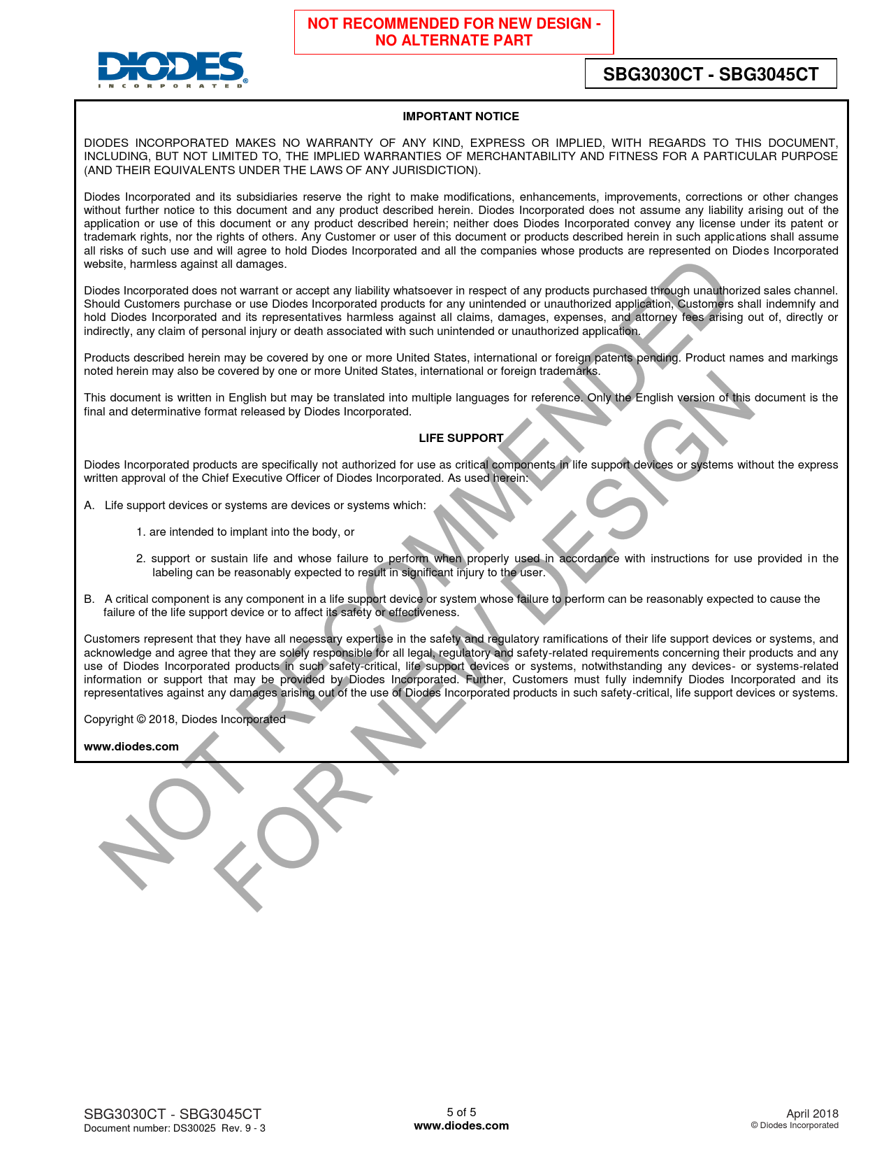 NOT RECOMMENDED FOR NEW DESIGN -. NO ALTERNATE PART. SBG3030CT - SBG3045CT. IMPORTANT NOTICE. LIFE SUPPORT. www.diodes.com
