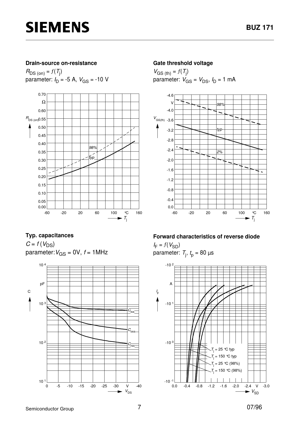 BUZ 171. Drain-source on-resistance. Gate threshold voltage. Typ. capacitances. Forward characteristics of reverse diode