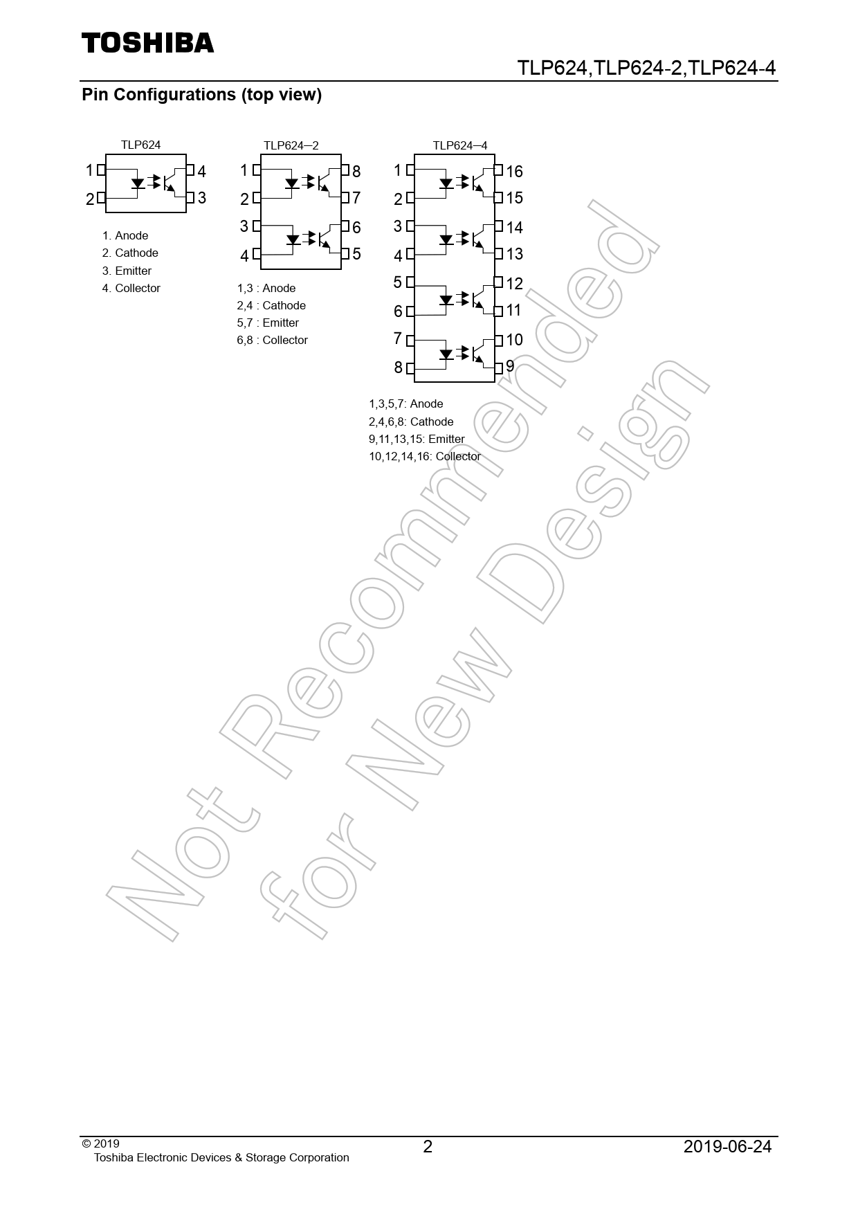 TLP624 TLP624–2 TLP624–4 1 4 1 8 1 16 2 3 2 7 2 15 3 6 3 1. Anode 14 2. Cathode 4 5 4 13 3. Emitter 4. Collector 1,3 : Anode 5 12 2,4 : Cathode 6 11 5,7 : Emit er 6,8 : Collector 7 10 8 9 1,3,5,7: Anode 2,4,6,8: Cathode 9,11,13,15: Emit er 10,12,14,16: Collector © 2019 2 2019-06-24 Toshiba Electronic Devices & Storage Corporation