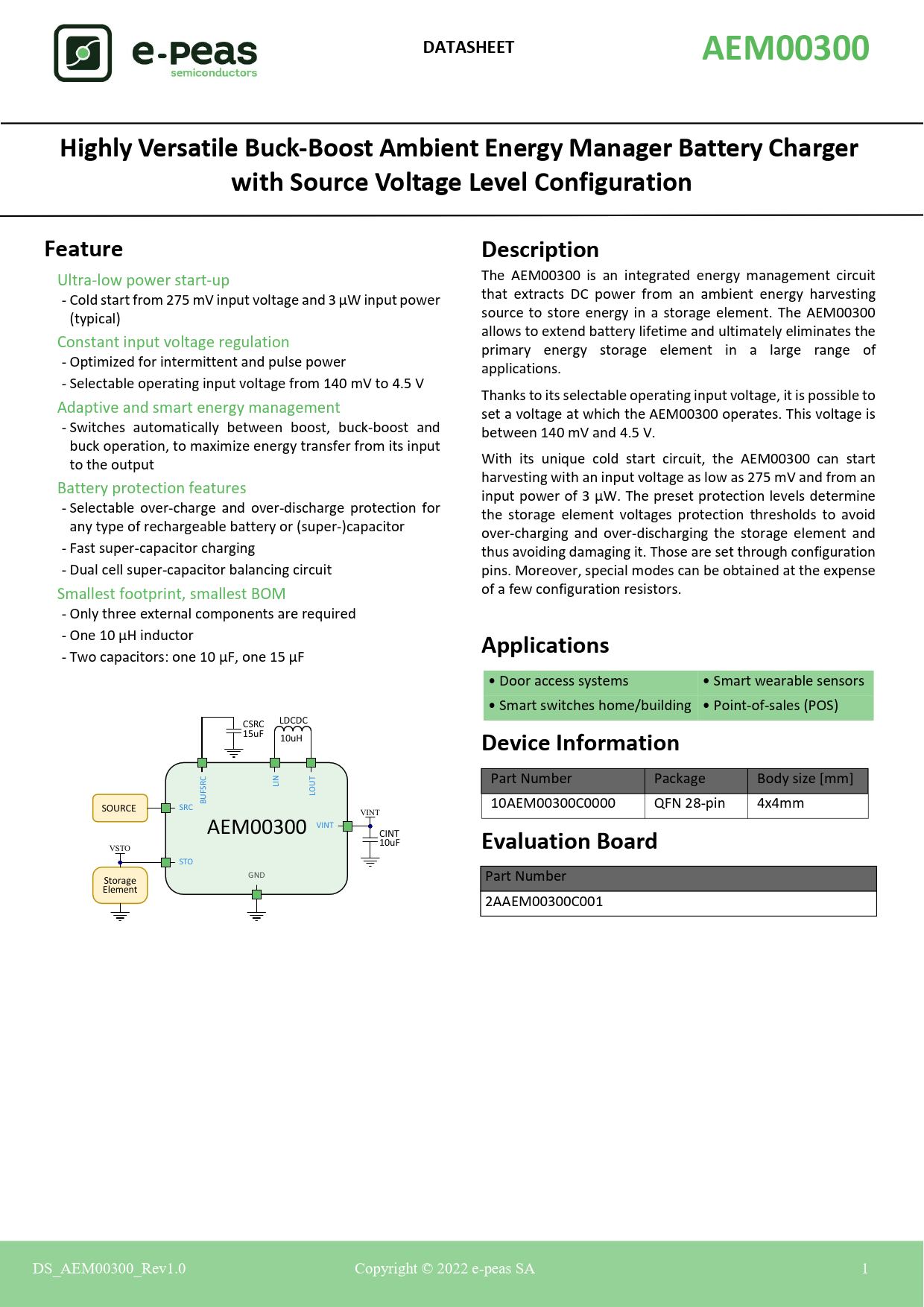DATASHEET. AEM00300. Highly Versatile Buck-Boost Ambient Energy Manager Battery Charger