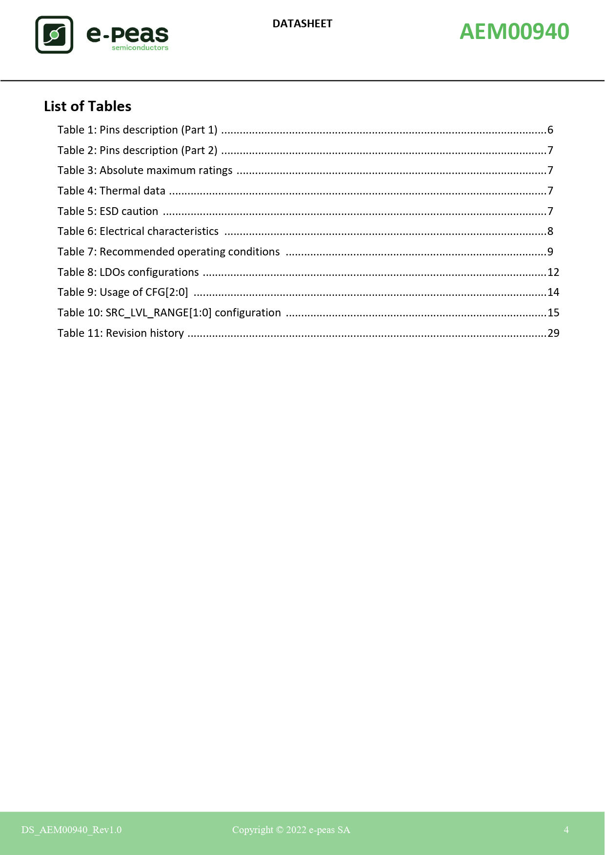 | 页数 / 页 | 29 / 4 — DATASHEET. AEM00940. List of Tables |