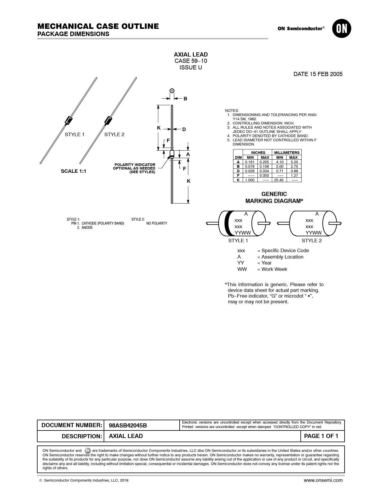PACKAGE DIMENSIONS. AXIAL LEAD. INCHES. MILLIMETERS. DIM. MIN. MAX. POLARITY INDICATOR. SCALE 1:1. OPTIONAL AS NEEDED. (SEE STYLES). GENERIC