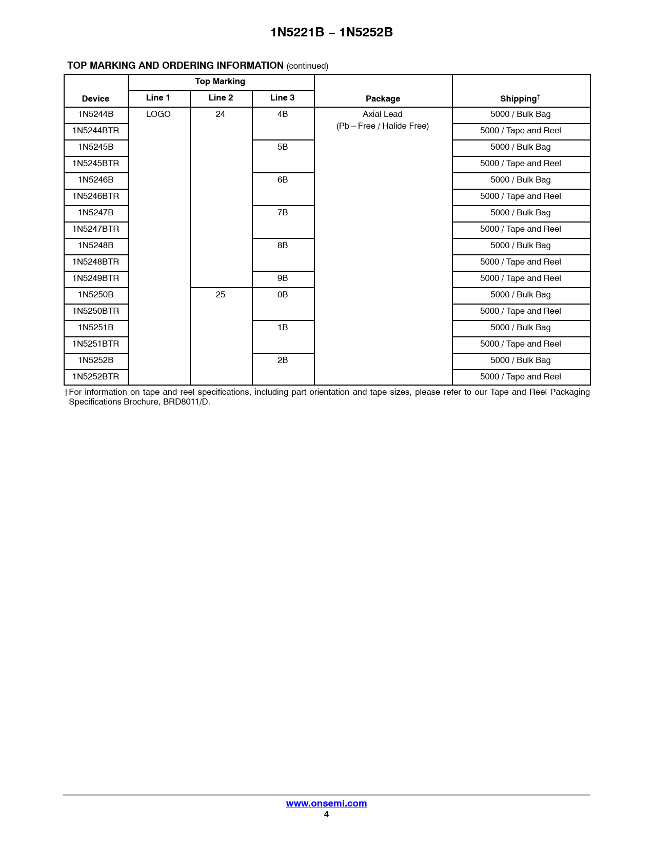 1N5244B LOGO 24 4B Axial Lead 5000 / Bulk Bag (Pb*Free / Halide Free) 1N5244BTR 5000 / Tape and Reel 1N5245B 5B 5000 / Bulk Bag 1N5245BTR 5000 / Tape and Reel 1N5246B 6B 5000 / Bulk Bag 1N5246BTR 5000 / Tape and Reel 1N5247B 7B 5000 / Bulk Bag 1N5247BTR 5000 / Tape and Reel 1N5248B 8B 5000 / Bulk Bag 1N5248BTR 5000 / Tape and Reel 1N5249BTR 9B 5000 / Tape and Reel 1N5250B 25 0B 5000 / Bulk Bag 1N5250BTR 5000 / Tape and Reel 1N5251B 1B 5000 / Bulk Bag 1N5251BTR 5000 / Tape and Reel 1N5252B 2B 5000 / Bulk Bag 1N5252BTR 5000 / Tape and Reel †For information on tape and reel specifications, including part orientation and tape sizes, please refer to our Tape and Reel Packaging Specifications Brochure, BRD8011/D.