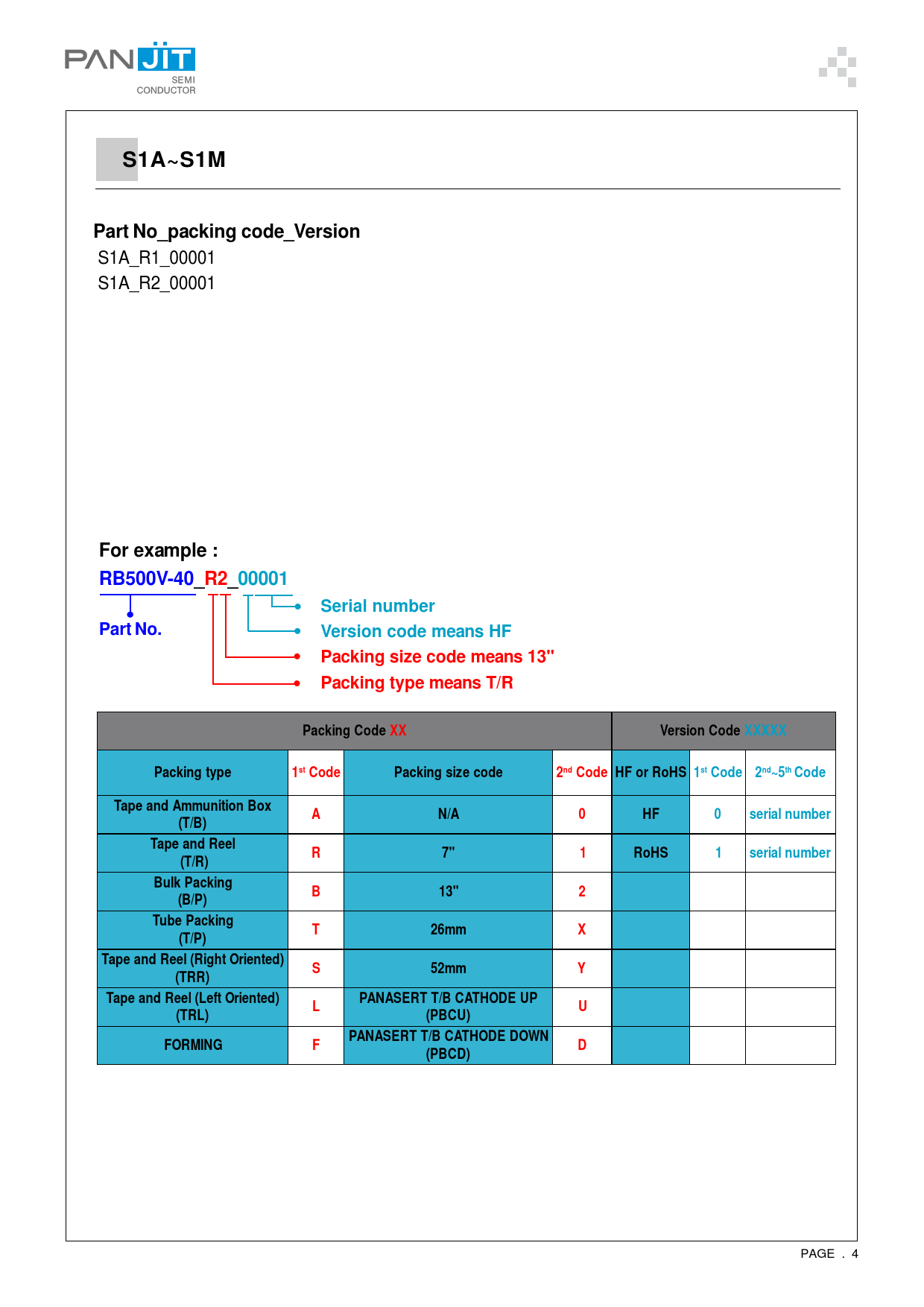 S1A~S1M Part No_packing code_Version S1A_R1_00001 S1A_R2_00001 For example : RB500V-40_R2_00001 Serial number Version code means HF Part No. Packing size code means 13" Packing type means T/R Packing Code XX Packing type Tape and Ammunition Box (T/B) Tape and Reel (T/R) Bulk Packing (B/P) Tube Packing (T/P) Tape and Reel (Right Oriented) (TRR) Tape and Reel (Left Oriented) (TRL) FORMING May 2,2018REV.07 Version Code XXXXX 1st Code Packing size code A N/A 0 HF 0 serial number R 7" 1 RoHS 1 serial number B 13" 2 T 26mm X S 52mm Y L F PANASERT T/B CATHODE UP (PBCU) PANASERT T/B CATHODE DOWN (PBCD) 2nd Code HF or RoHS 1st Code 2nd~5th Code U D PAGE . 4