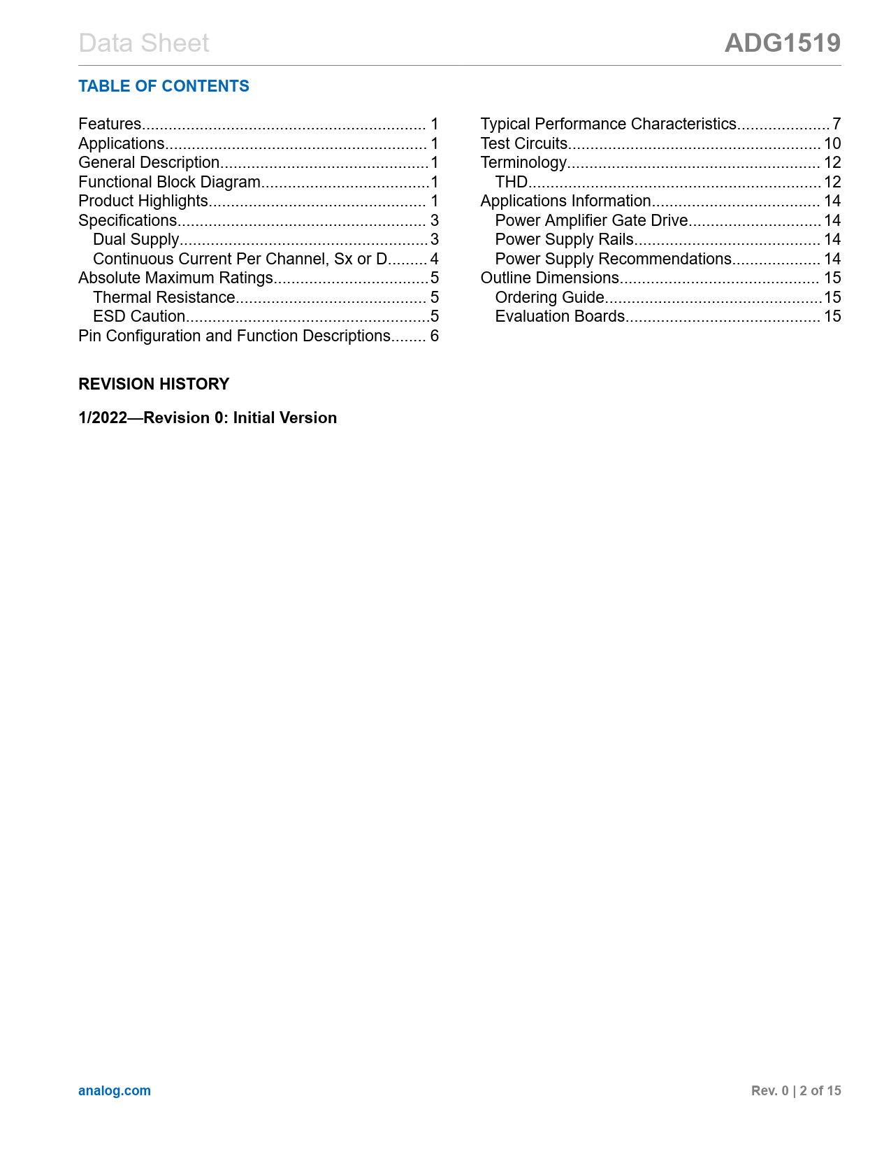 ADG1519. TABLE OF CONTENTS. REVISION HISTORY. 1/2022—Revision 0: Initial Version. analog.com. Rev. 0 | 2 of 15