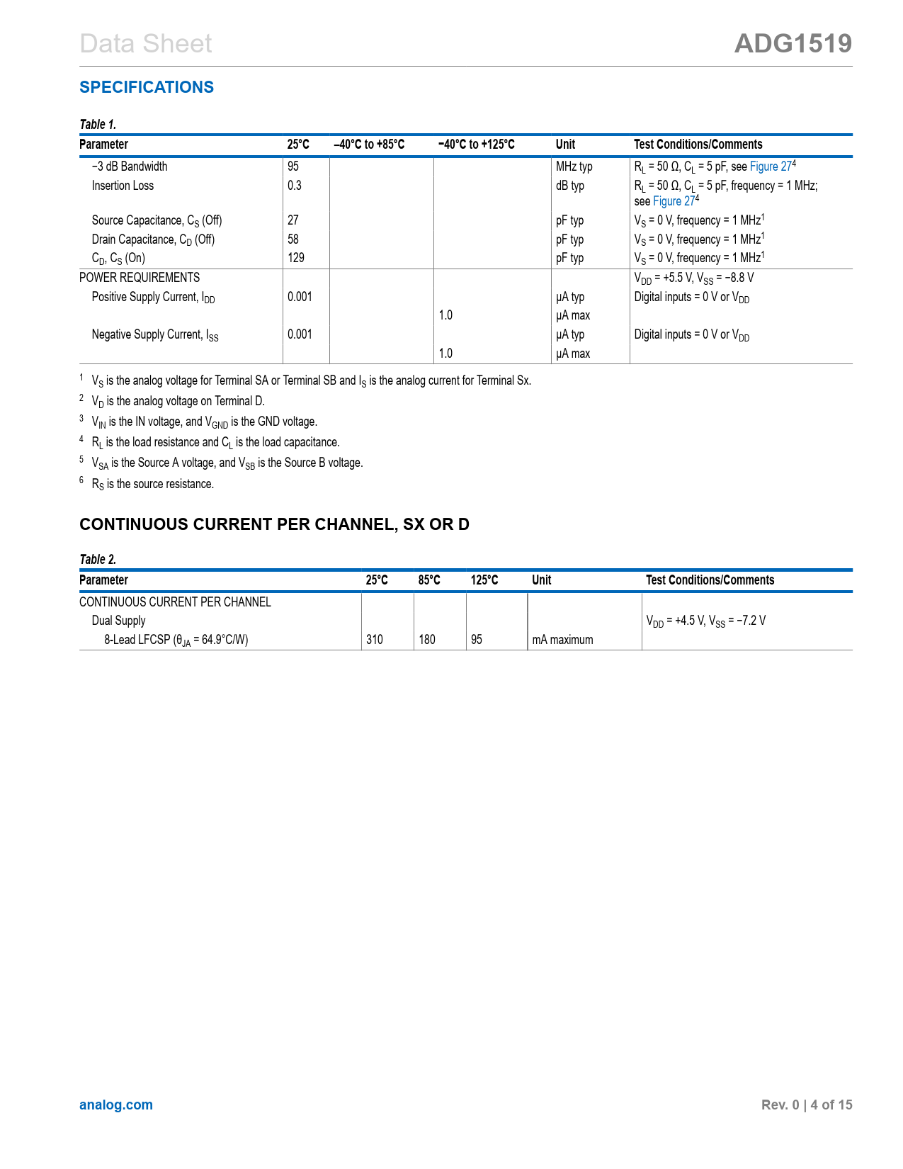 页数 / 页15 / 4 — ADG1519. SPECIFICATIONS. Table 1. Parameter. 25°C. –40°C to +85°C. −40°C …