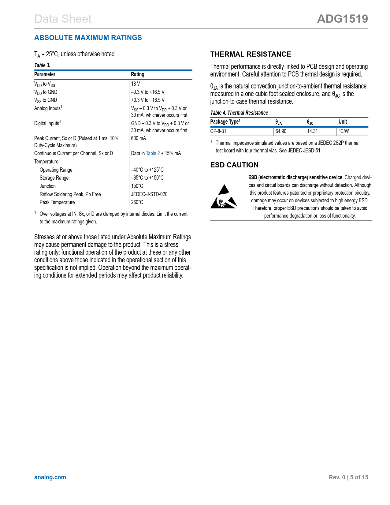 link to page 5 link to page 5 link to page 4 link to page 5 Data Sheet ADG1519ABSOLUTE MAXIMUM RATINGS TA = 25°C, unless otherwise noted. THERMAL RESISTANCETable 3. Thermal performance is directly linked to PCB design and operating ParameterRating environment. Careful attention to PCB thermal design is required. VDD to VSS 18 V θJA is the natural convection junction-to-ambient thermal resistance VDD to GND –0.3 V to +16.5 V measured in a one cubic foot sealed enclosure, and θJC is the VSS to GND +0.3 V to −16.5 V junction-to-case thermal resistance. Analog Inputs1 VSS – 0.3 V to VDD + 0.3 V or 30 mA, whichever occurs first Table 4. Thermal Resistance Digital Inputs1 GND – 0.3 V to V Package Type1θ DD + 0.3 V or JAθJCUnit 30 mA, whichever occurs first CP-8-31 64.90 14.31 °C/W Peak Current, Sx or D (Pulsed at 1 ms, 10% 600 mA 1 Duty-Cycle Maximum) Thermal impedance simulated values are based on a JEDEC 2S2P thermal Continuous Current per Channel, Sx or D Data in Table 2 + 15% mA test board with four thermal vias. See JEDEC JESD-51. Temperature ESD CAUTION Operating Range –40°C to +125°C Storage Range –65°C to +150°C ESD (electrostatic discharge) sensitive device . Charged devi- Junction 150°C ces and circuit boards can discharge without detection. Although Reflow Soldering Peak, Pb Free JEDEC-J-STD-020 this product features patented or proprietary protection circuitry, Peak Temperature 260°C damage may occur on devices subjected to high energy ESD. Therefore, proper ESD precautions should be taken to avoid 1 Over voltages at IN, Sx, or D are clamped by internal diodes. Limit the current performance degradation or loss of functionality. to the maximum ratings given. Stresses at or above those listed under Absolute Maximum Ratings may cause permanent damage to the product. This is a stress rating only; functional operation of the product at these or any other conditions above those indicated in the operational section of this specification is not implied. Operation beyond the maximum operat- ing conditions for extended periods may affect product reliability. analog.comRev. 0 | 5 of 15 Document Outline Features Applications General Description Functional Block Diagram Product Highlights Specifications Dual Supply Continuous Current Per Channel, Sx or D Absolute Maximum Ratings Thermal Resistance ESD Caution Pin Configuration and Function Descriptions Typical Performance Characteristics Test Circuits Terminology IDD ISS VD and VS RON RFLAT ON IS Off ID Off ID and IS On VINL VINH IINL and IINH CS Off CD Off CD and CS On CIN tON EN tOFF EN tTRANSITION TD Charge Injection Off Isolation Crosstalk Bandwidth Insertion Loss THD + N THD AC PSRR Applications Information Power Amplifier Gate Drive Power Supply Rails Power Supply Recommendations Outline Dimensions Ordering Guide Evaluation Boards