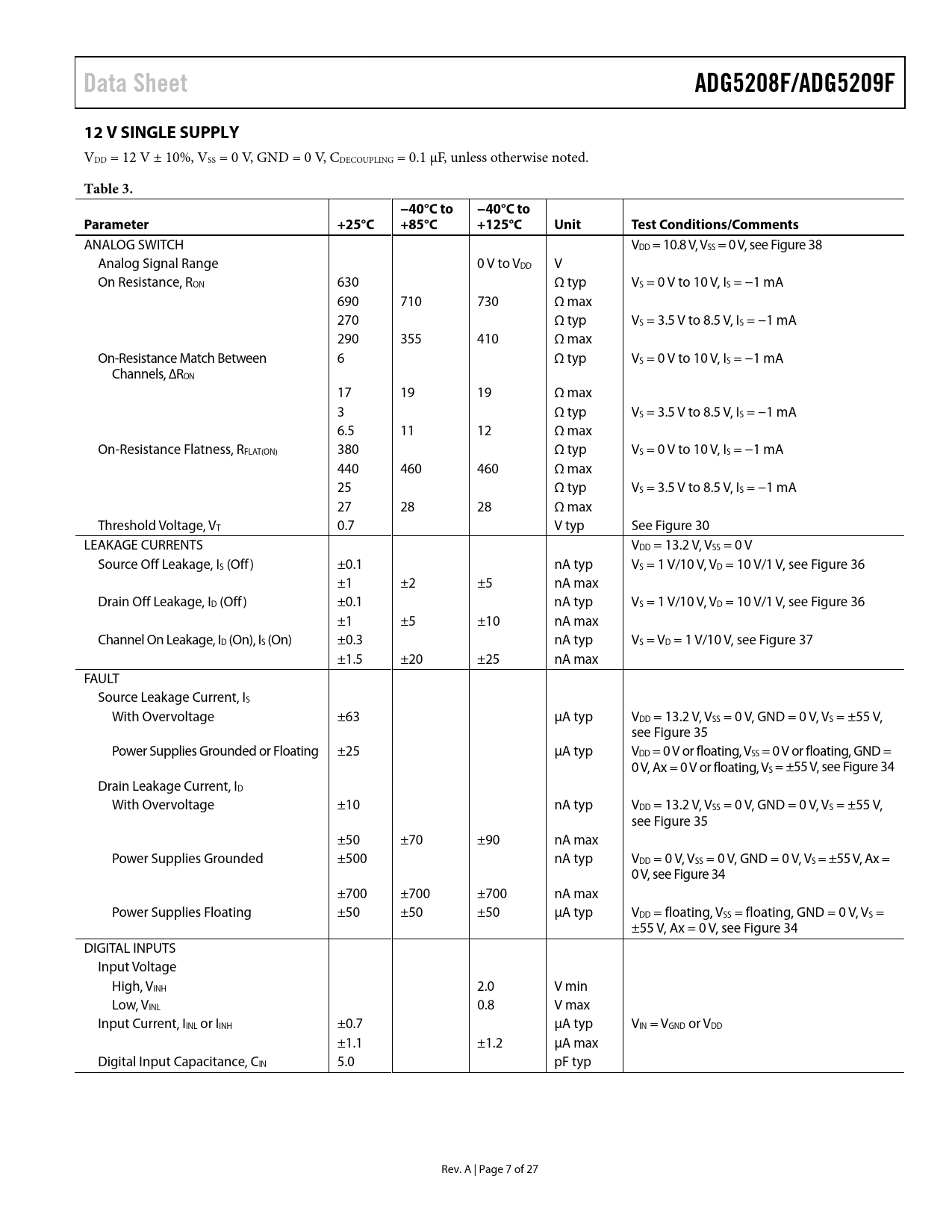 Data Sheet. ADG5208F/ADG5209F. 12 V SINGLE SUPPLY. Table 3. −40°C to. Parameter. +25°C. +85°C. +125°C. Unit. Test Conditions/Comments