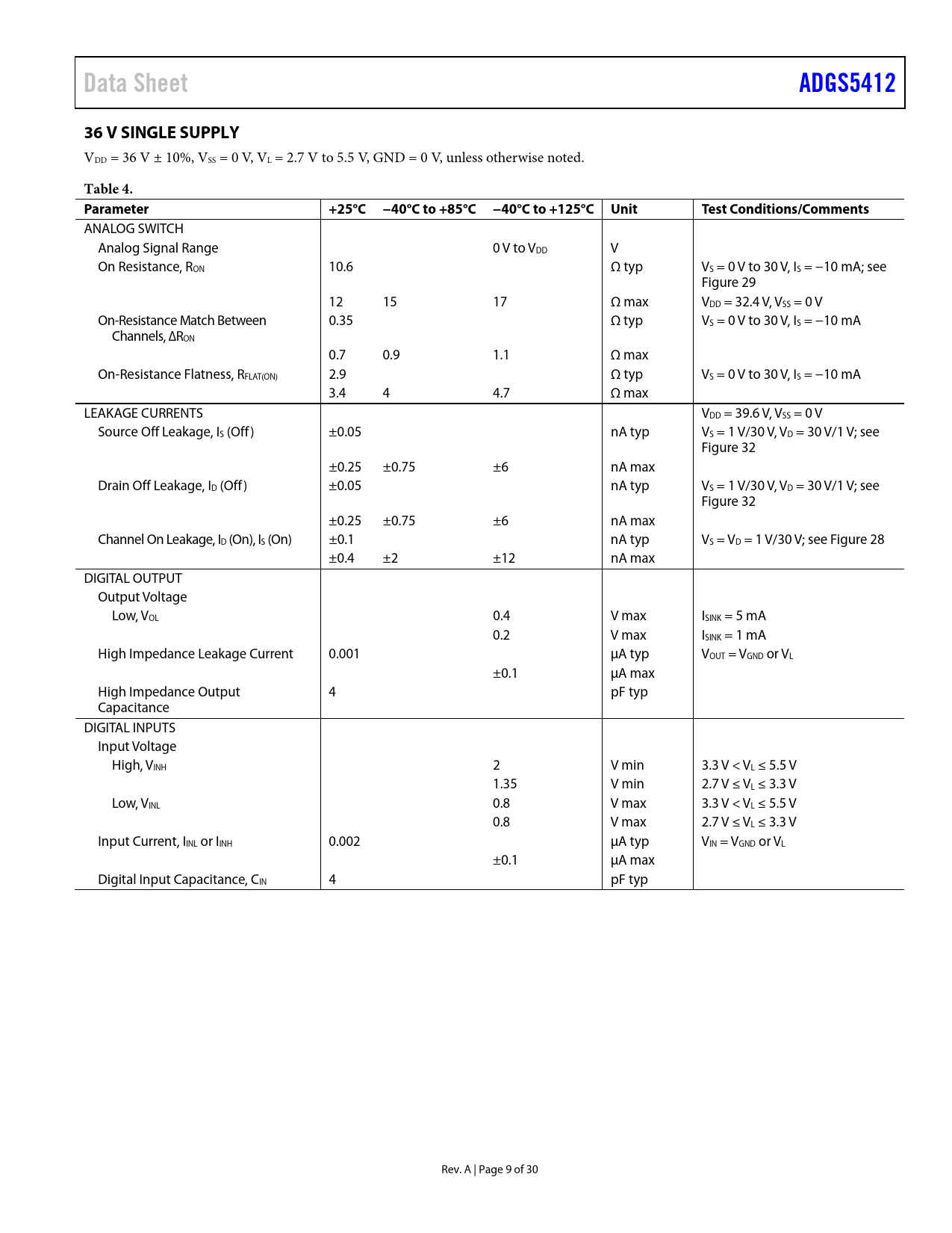 Data Sheet ADGS5412 36 V SINGLE SUPPLY Table 4 Parameter +25°C −40°C to +85°C −40°C to +125°C Unit Test Conditions/Comments
