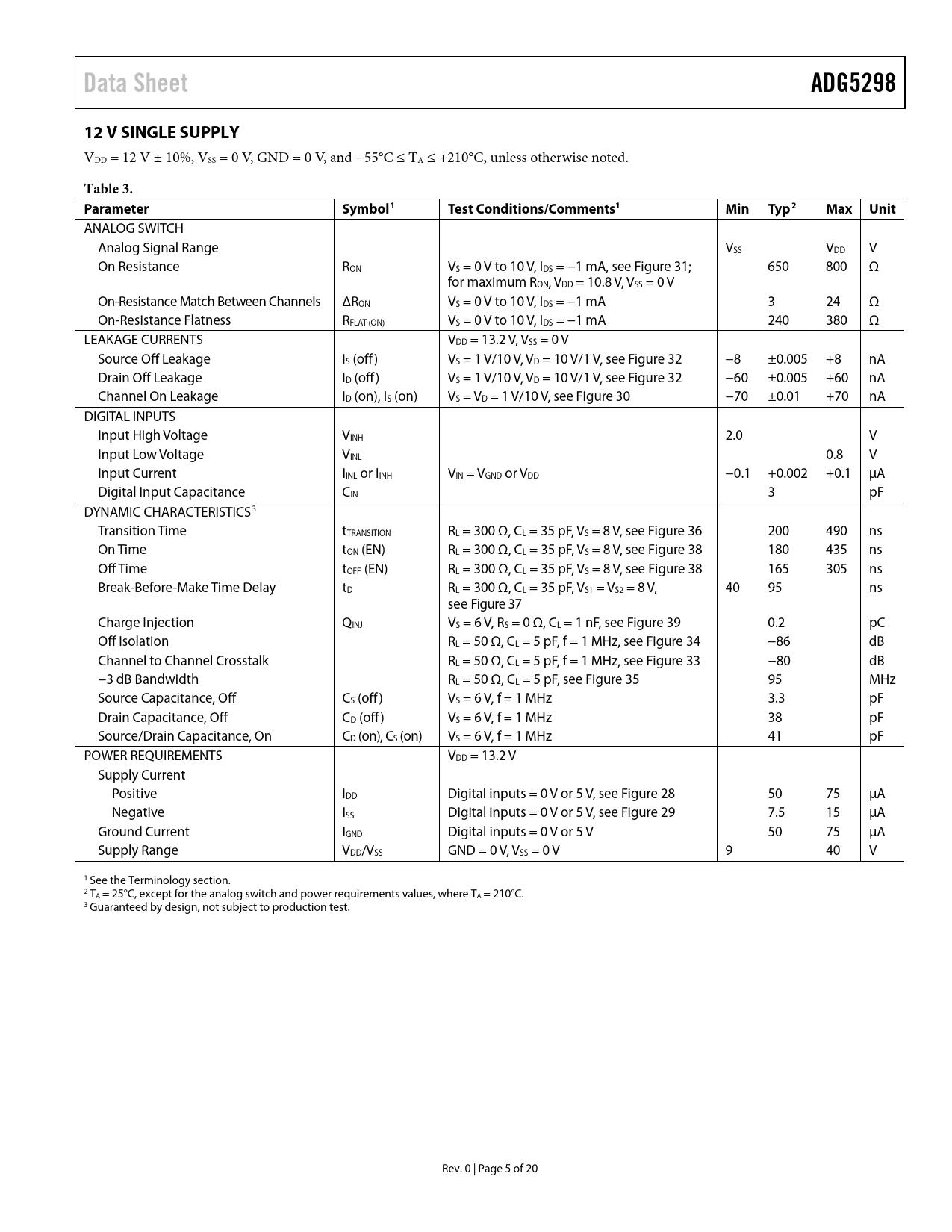 Data Sheet ADG5298 12 V SINGLE SUPPLY Table 3 Parameter Symbol1 Test Conditions/Comments1 Min Typ2 Max Unit