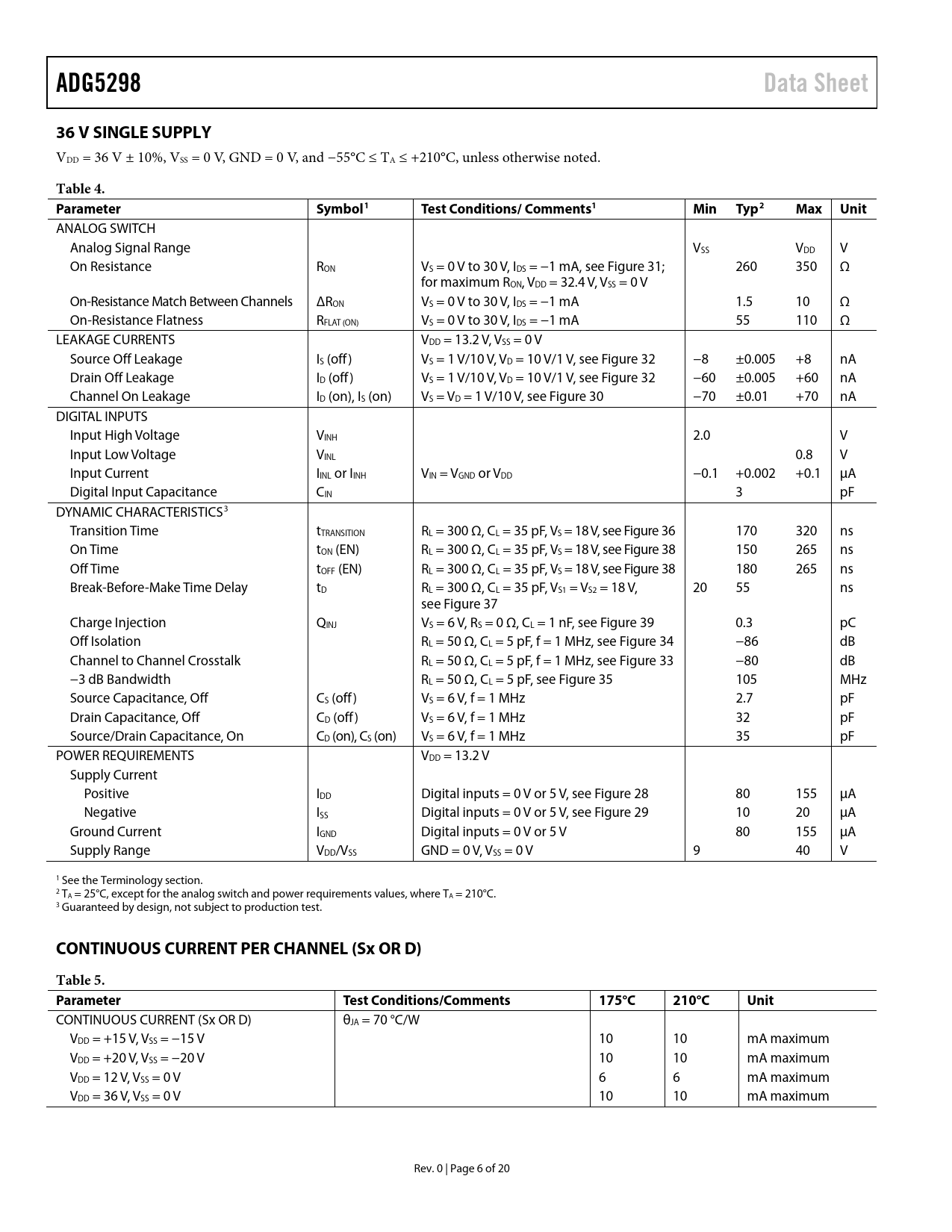 ADG5298 Data Sheet 36 V SINGLE SUPPLY Table 4 Parameter Symbol1 Test Conditions/ Comments1 Min Typ2 Max Unit