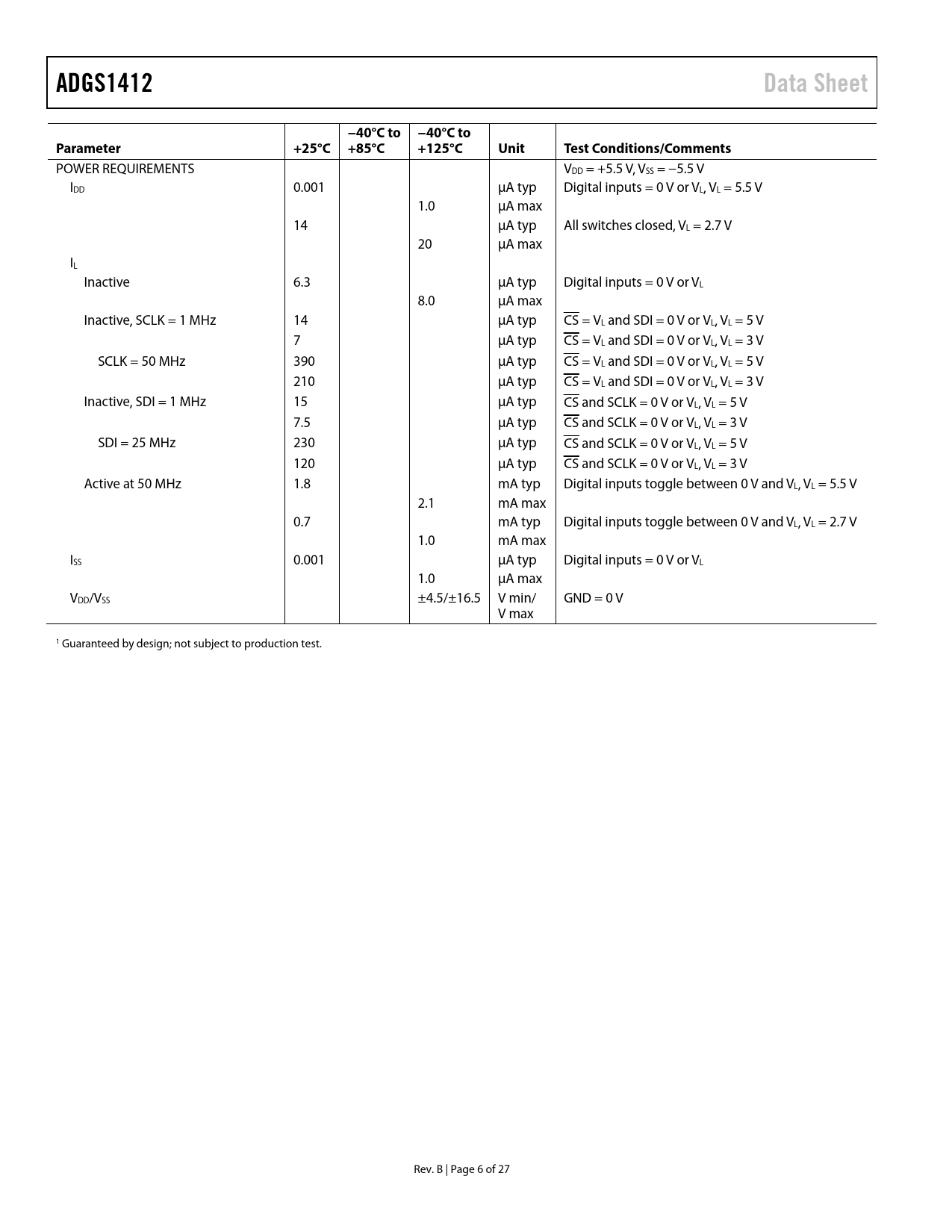 页数 / 页27 / 6 — ADGS1412. Data Sheet. −40°C to. Parameter +25°C. +85°C. +125°C Unit Test. …