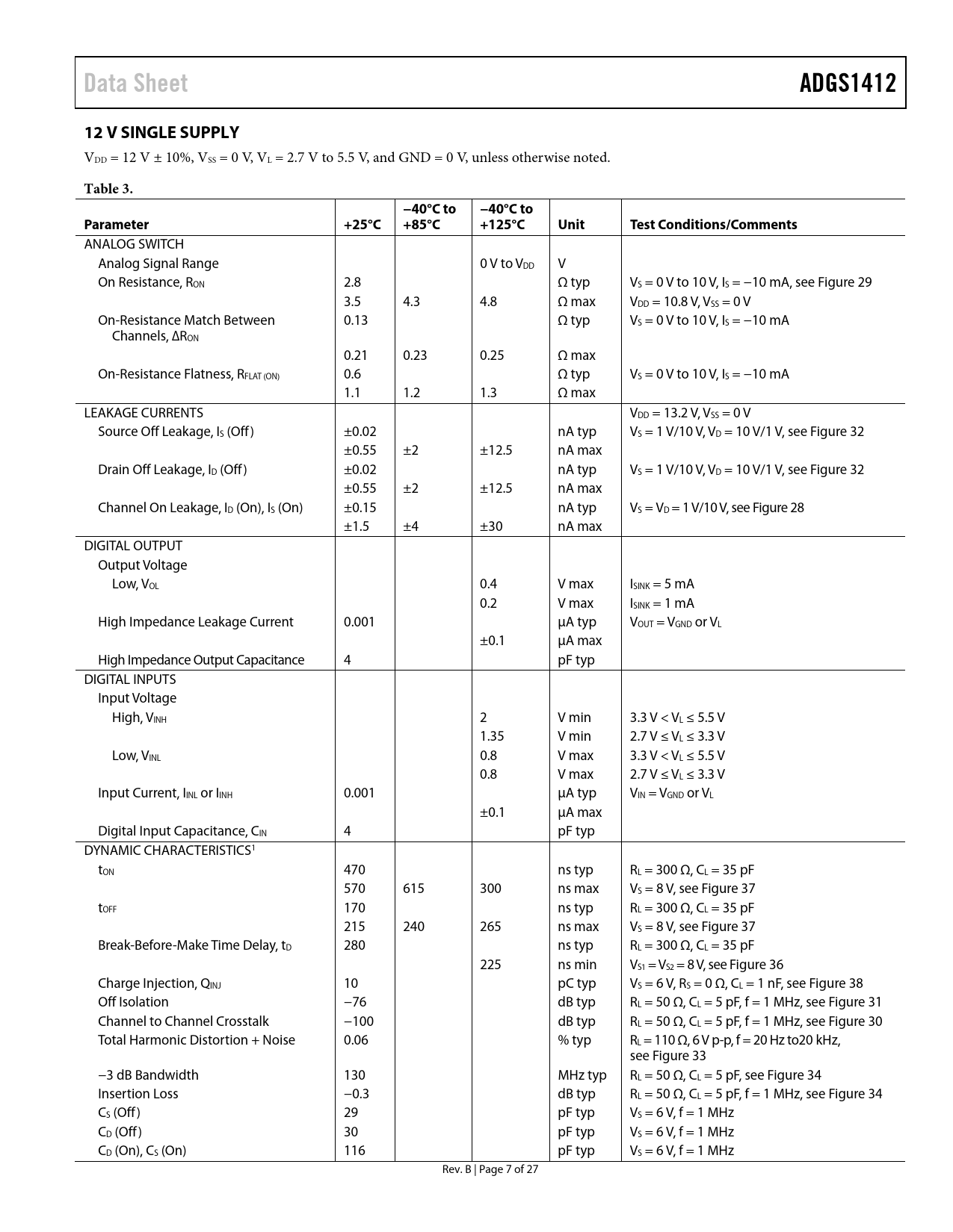 页数 / 页27 / 7 — Data Sheet. ADGS1412. 12 V SINGLE SUPPLY. Table 3. −40°C to. Parameter …
