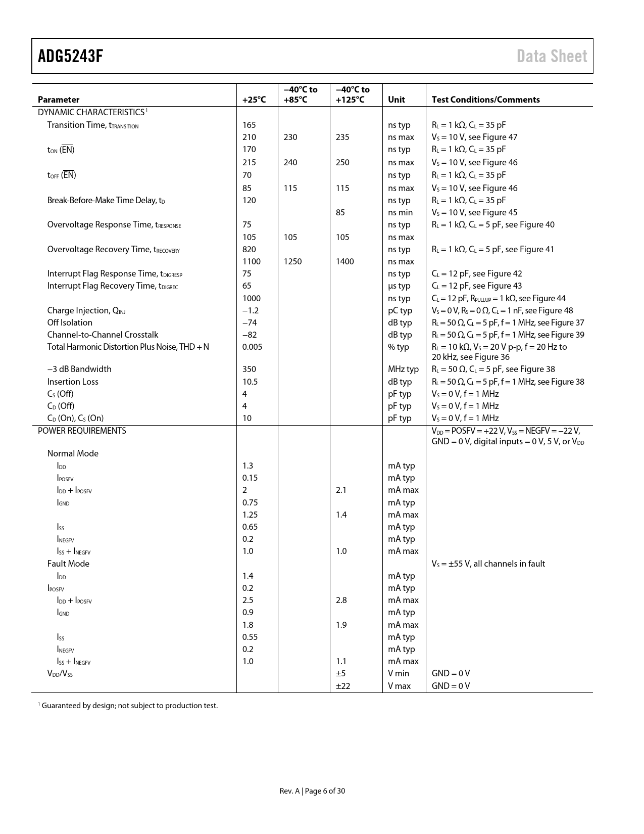 ADG5243F. Data Sheet. −40°C to. Parameter. +25°C. +85°C. +125°C. Unit. Test Conditions/Comments