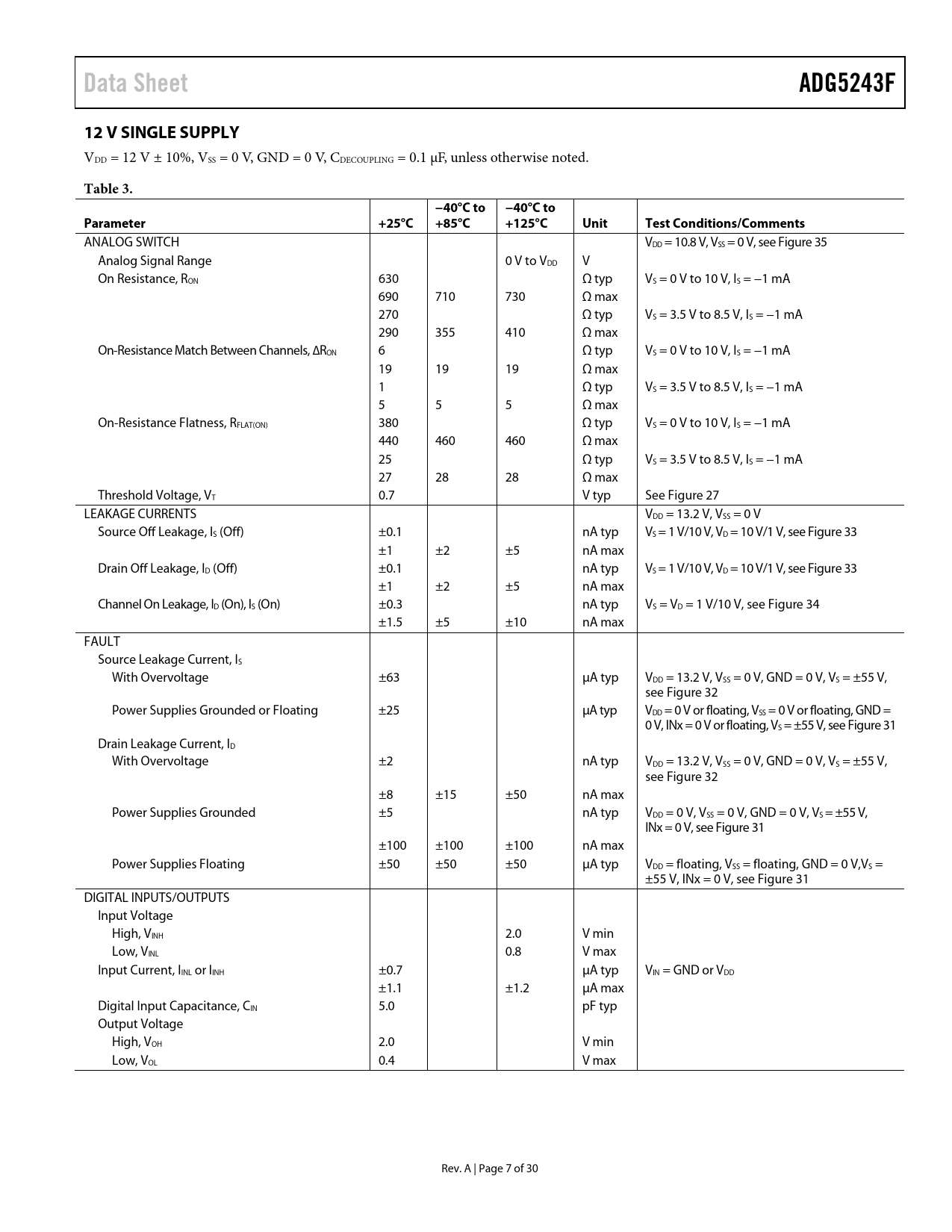 页数 / 页30 / 7 — Data Sheet. ADG5243F. 12 V SINGLE SUPPLY. Table 3. −40°C to. Parameter. …