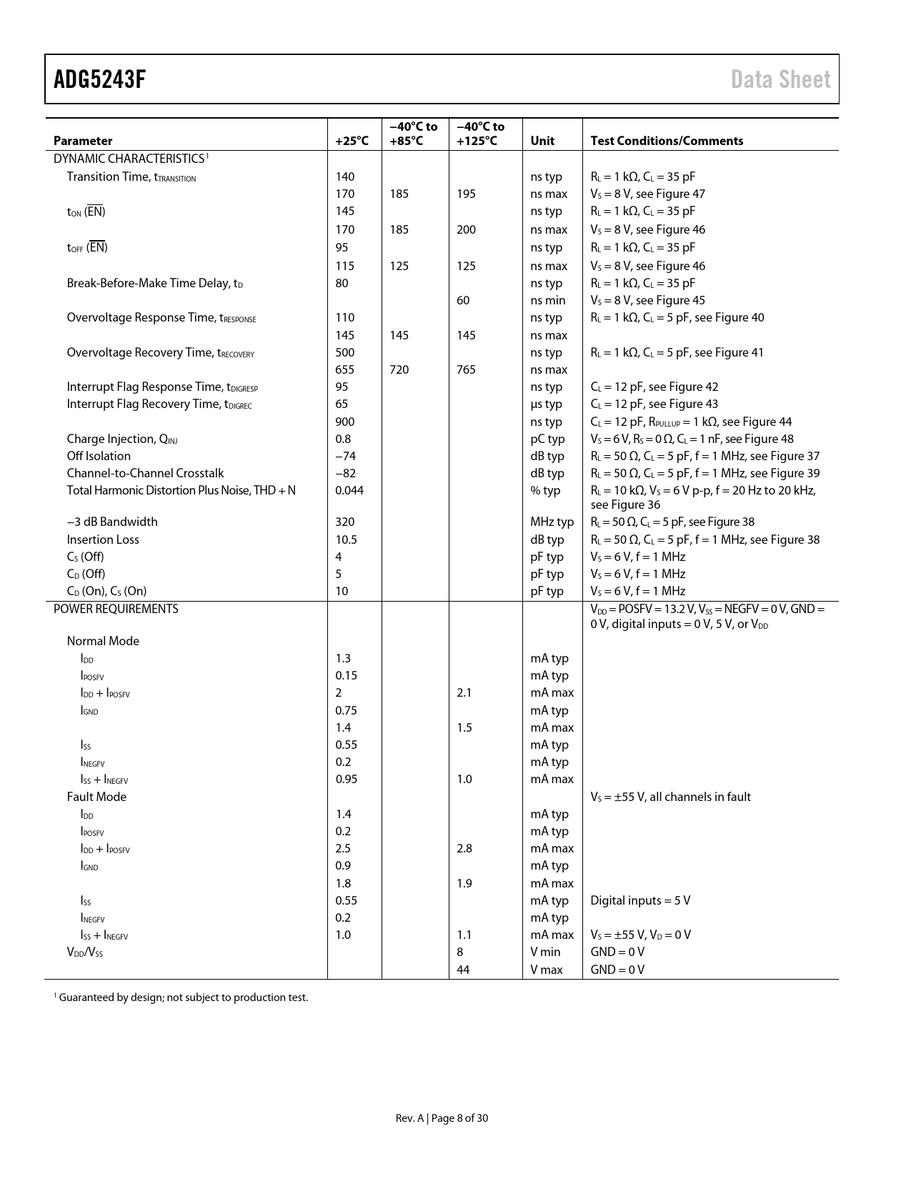 link to page 23 link to page 23 link to page 23 link to page 22 link to page 21 link to page 21 link to page 21 link to page 22 link to page 22 link to page 23 link to page 20 link to page 20 link to page 20 link to page 20 link to page 20 link to page 11 ADG5243FData Sheet−40°C to−40°C toParameter+25°C+85°C+125°CUnitTest Conditions/Comments DYNAMIC CHARACTERISTICS1 Transition Time, tTRANSITION 140 ns typ RL = 1 kΩ, CL = 35 pF 170 185 195 ns max VS = 8 V, see Figure 47 tON (EN) 145 ns typ RL = 1 kΩ, CL = 35 pF 170 185 200 ns max VS = 8 V, see Figure 46 tOFF (EN) 95 ns typ RL = 1 kΩ, CL = 35 pF 115 125 125 ns max VS = 8 V, see Figure 46 Break-Before-Make Time Delay, tD 80 ns typ RL = 1 kΩ, CL = 35 pF 60 ns min VS = 8 V, see Figure 45 Overvoltage Response Time, tRESPONSE 110 ns typ RL = 1 kΩ, CL = 5 pF, see Figure 40 145 145 145 ns max Overvoltage Recovery Time, tRECOVERY 500 ns typ RL = 1 kΩ, CL = 5 pF, see Figure 41 655 720 765 ns max Interrupt Flag Response Time, tDIGRESP 95 ns typ CL = 12 pF, see Figure 42 Interrupt Flag Recovery Time, tDIGREC 65 µs typ CL = 12 pF, see Figure 43 900 ns typ CL = 12 pF, RPULLUP = 1 kΩ, see Figure 44 Charge Injection, QINJ 0.8 pC typ VS = 6 V, RS = 0 Ω, CL = 1 nF, see Figure 48 Off Isolation −74 dB typ RL = 50 Ω, CL = 5 pF, f = 1 MHz, see Figure 37 Channel-to-Channel Crosstalk −82 dB typ RL = 50 Ω, CL = 5 pF, f = 1 MHz, see Figure 39 Total Harmonic Distortion Plus Noise, THD + N 0.044 % typ RL = 10 kΩ, VS = 6 V p-p, f = 20 Hz to 20 kHz, see Figure 36 −3 dB Bandwidth 320 MHz typ RL = 50 Ω, CL = 5 pF, see Figure 38 Insertion Loss 10.5 dB typ RL = 50 Ω, CL = 5 pF, f = 1 MHz, see Figure 38 CS (Off) 4 pF typ VS = 6 V, f = 1 MHz CD (Off) 5 pF typ VS = 6 V, f = 1 MHz CD (On), CS (On) 10 pF typ VS = 6 V, f = 1 MHz POWER REQUIREMENTS VDD = POSFV = 13.2 V, VSS = NEGFV = 0 V, GND = 0 V, digital inputs = 0 V, 5 V, or VDD Normal Mode IDD 1.3 mA typ IPOSFV 0.15 mA typ IDD + IPOSFV 2 2.1 mA max IGND 0.75 mA typ 1.4 1.5 mA max ISS 0.55 mA typ INEGFV 0.2 mA typ ISS + INEGFV 0.95 1.0 mA max Fault Mode VS = ±55 V, all channels in fault IDD 1.4 mA typ IPOSFV 0.2 mA typ IDD + IPOSFV 2.5 2.8 mA max IGND 0.9 mA typ 1.8 1.9 mA max ISS 0.55 mA typ Digital inputs = 5 V INEGFV 0.2 mA typ ISS + INEGFV 1.0 1.1 mA max VS = ±55 V, VD = 0 V VDD/VSS 8 V min GND = 0 V 44 V max GND = 0 V 1 Guaranteed by design; not subject to production test. Rev. A | Page 8 of 30 Document Outline FEATURES APPLICATIONS FUNCTIONAL BLOCK DIAGRAM GENERAL DESCRIPTION PRODUCT HIGHLIGHTS REVISION HISTORY SPECIFICATIONS ±15 V DUAL SUPPLY ±20 V DUAL SUPPLY 12 V SINGLE SUPPLY 36 V SINGLE SUPPLY CONTINUOUS CURRENT PER CHANNEL, Sx OR Dx ABSOLUTE MAXIMUM RATINGS ESD CAUTION PIN CONFIGURATIONS AND FUNCTION DESCRIPTIONS TYPICAL PERFORMANCE CHARACTERISTICS TEST CIRCUITS TERMINOLOGY THEORY OF OPERATION SWITCH ARCHITECTURE ESD Performance Trench Isolation USER DEFINED FAULT PROTECTION Power-On Protection Power-Off Protection Digital Input Protection Overvoltage Interrupt Flag APPLICATIONS INFORMATION POWER SUPPLY RAILS POWER SUPPLY SEQUENCING PROTECTION SIGNAL RANGE POWER SUPPLY RECOMMENDATIONS HIGH VOLTAGE SURGE SUPPRESSION INTELLIGENT FAULT DETECTION LARGE VOLTAGE, HIGH FREQUENCY SIGNALS OUTLINE DIMENSIONS ORDERING GUIDE