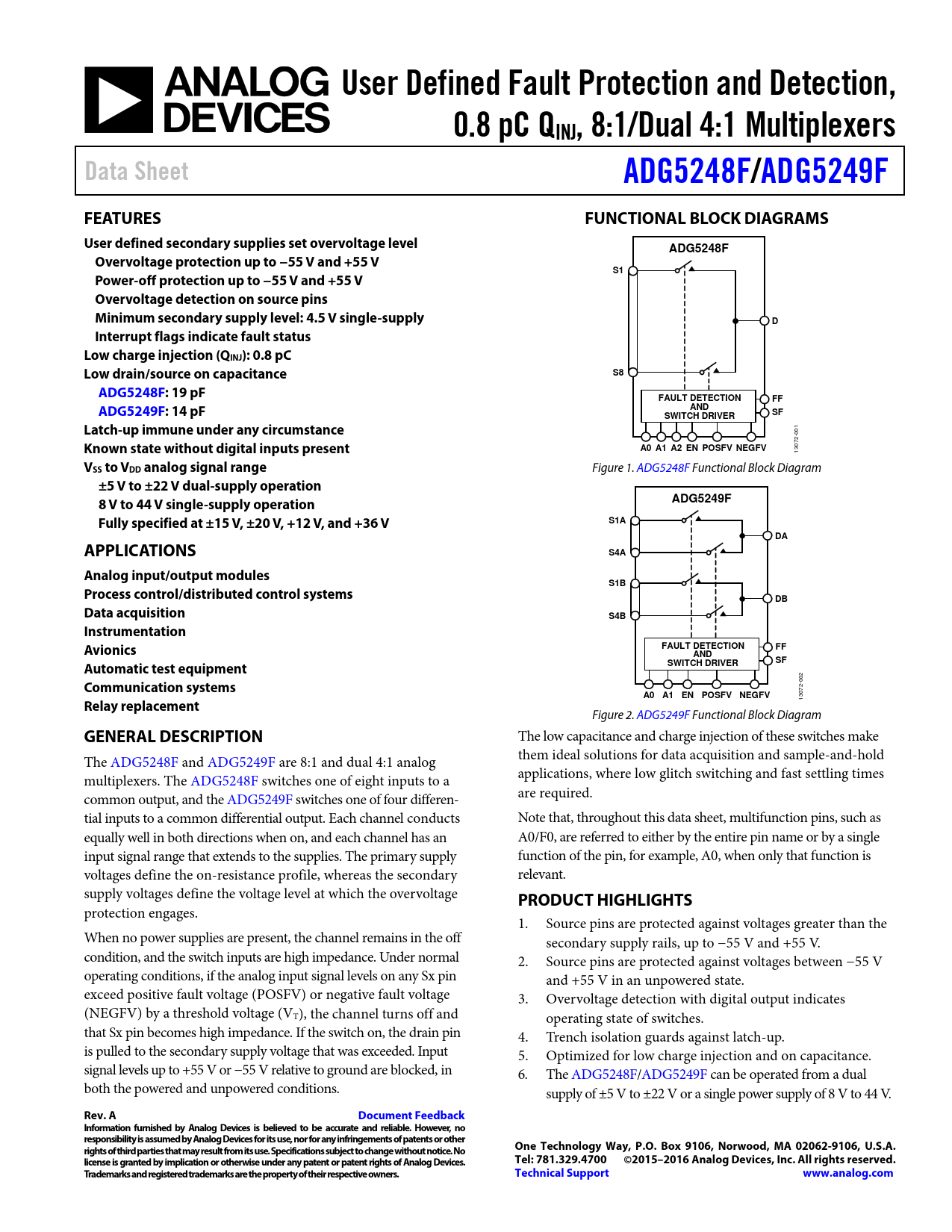 User Defined Fault Protection and Detection,. 0.8 pC QINJ, 8:1/Dual 4:1 Multiplexers. Data Sheet. ADG5248F/. ADG5249F. FEATURES