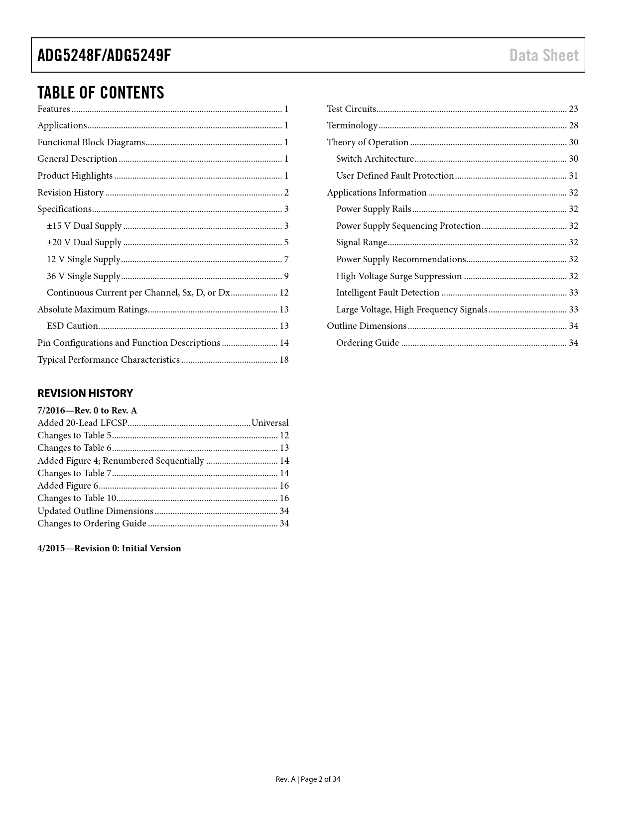 页数 / 页34 / 2 — ADG5248F/ADG5249F. Data Sheet. TABLE OF CONTENTS. REVISION HISTORY. …
